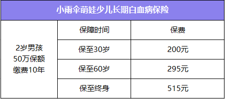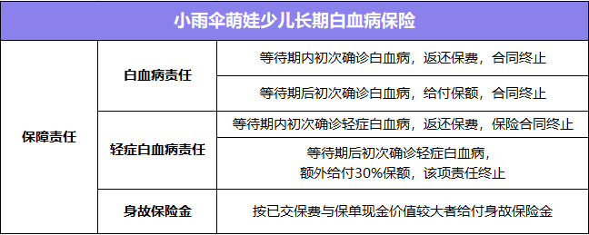 接下来,给大家具体介绍一下小雨伞萌娃少儿长期白血病保险的亮点: