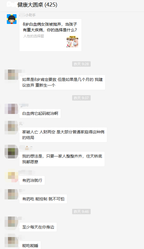 ),向大家提了个问题:遇到孩子有重疾,你会怎么办?群里的讨论非常激烈。