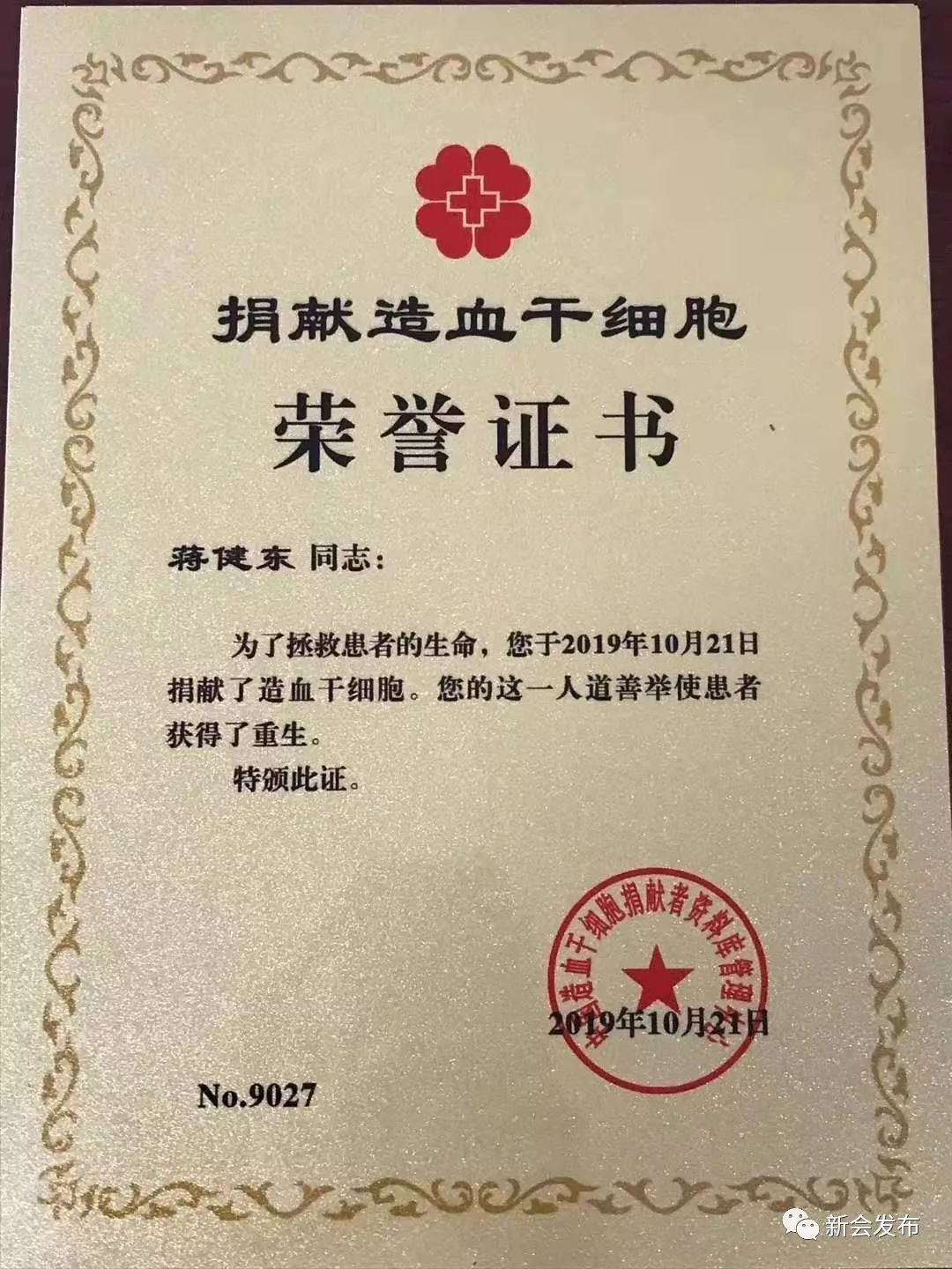 在捐献的过程中,新会区红十字志愿者对蒋健东全程陪伴在侧,做好服务工作。为了表彰蒋健东的善举,新会区红十字会向蒋健东送上中国造血干细胞捐献者资料库管理中心颁发的荣誉证书。