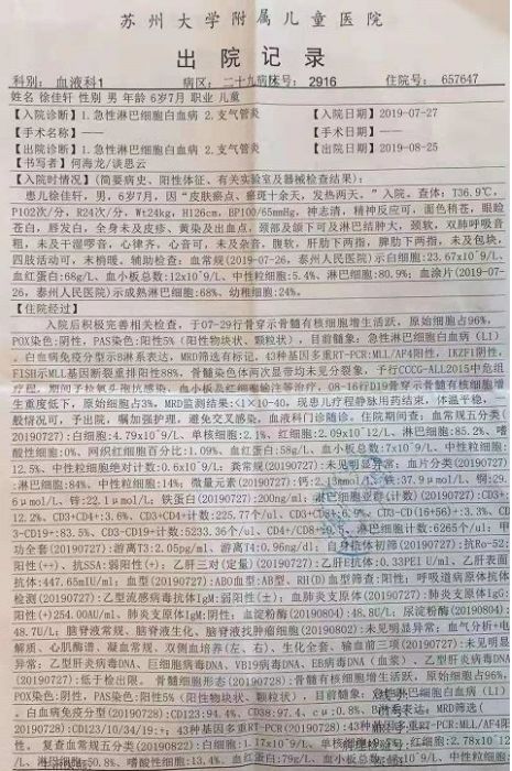 先到泰州人民医院急诊,连夜转至苏州大学附属儿童医院抢救治疗,并确诊为急性淋巴细胞白血病,噩耗直接击碎了这个家庭的梦想和未来,一切如同天塌。