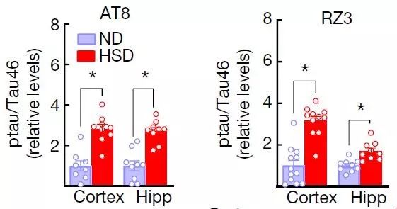 ▲连续数周摄入高盐后,小鼠大脑皮质和海马区的tau蛋白出现过度磷酸化(图片来源:参考资料[1])