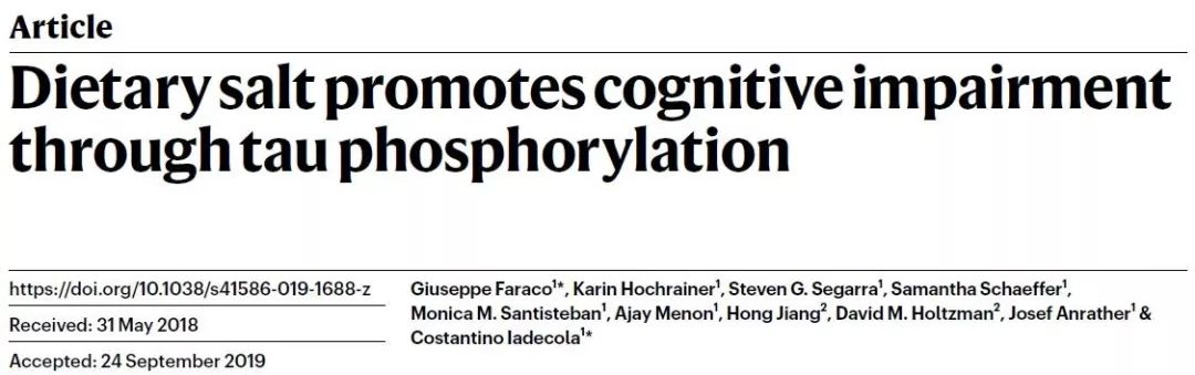 [1] Giuseppe Faraco et al., (2019) Dietary salt promotes cognitive impairmentthrough tau phosphorylation. Nature. DOI: 10.1038/s41586-019-1688-z[2] Giuseppe Faraco et al., (2018) Dietary salt promotes neurovascular and cognitive dysfunction through a gut-initiated TH17 response. Nature Neuroscience. DOI: https://doi.org/10.1038/s41593-017-0059-z