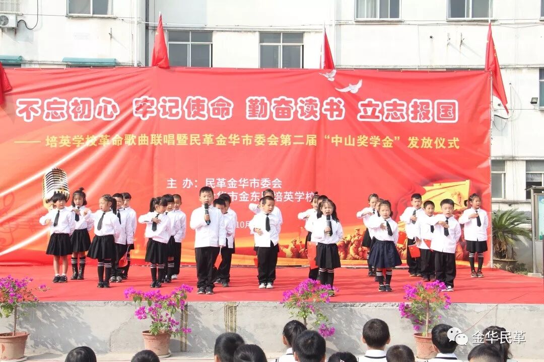 10月25日上午,培英学校革命歌曲联唱暨民革金华市委会第二届“中山奖学金”发放仪式在一曲爱国歌曲中拉开帷幕。金华市政协副主席、民革金华市委会主委荣安华,金华市政协科教文卫专委会主任楼余产,民革金华市委会副主委方青、赵舒,秘书长周金华出席活动。