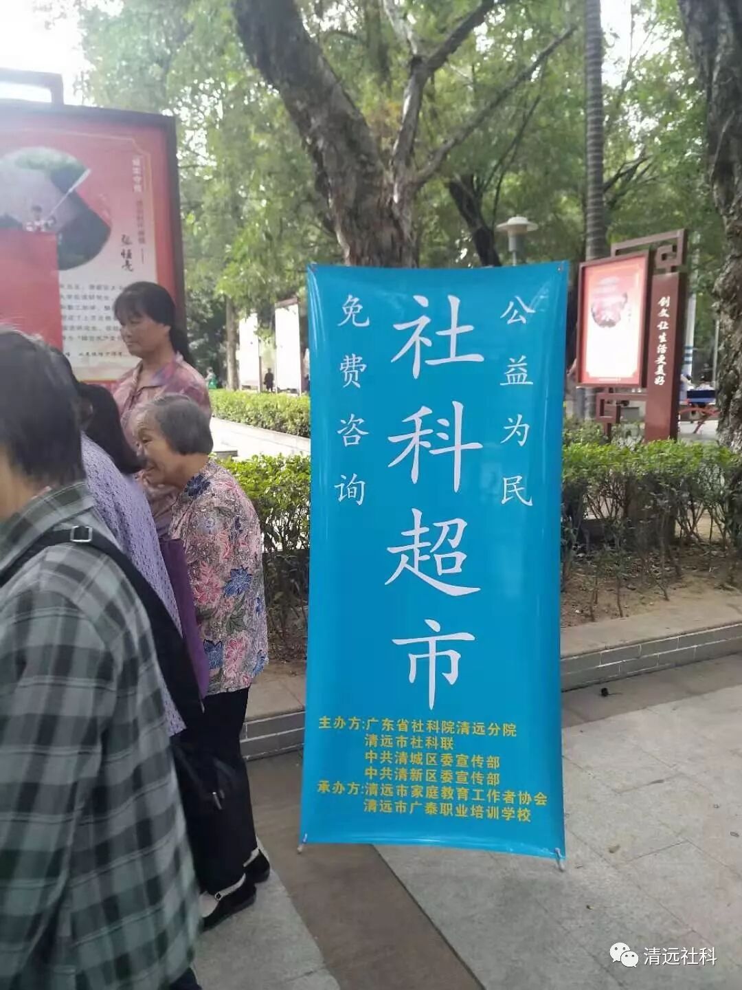 “社会科学免费流动超市”(简称“社科超市)”是广东省社科院清远分院、清远市社科联首创的面向基层群众普及社科知识的新创举。通过向周围群众宣传习近平新时代中国特色社会主义思想、组织社保、法律、心理、家庭教育、写作方面的专业人士接受群众咨询、派发社会科学书刊等方式,旨在增强市民的社会科学意识,使人民群众更加了解社会科学、相信社会科学,自觉用社会科学思维来应对生活中的问题。