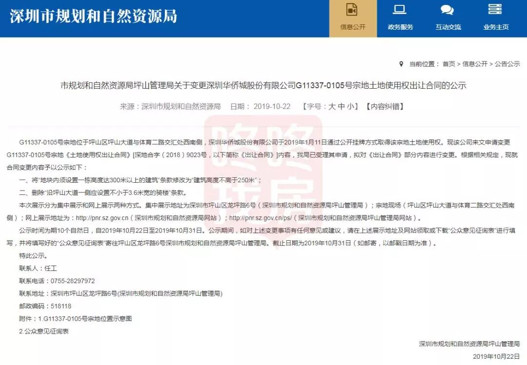 10月22日,深圳市规划和自然资源局发布《关于变更深圳华侨城股份有限公司G11337-0105号宗地土地使用权出让合同的公示》。