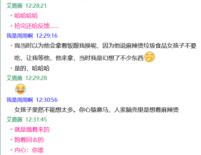 结果过会就收到了他的消息,他说你的麻辣烫挺好吃的,要是没有那个蚯蚓一样的东西就更好了……