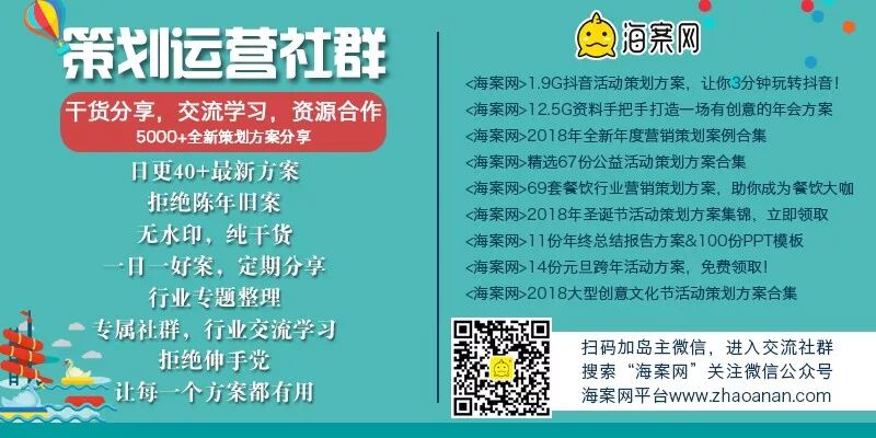 如果目前的策划案专题合集中没有您需要的,而您又急需某个活动的策划方案,您可以在微信公众号后台留言,比如:抖音比赛方案-愿付费(岛主的方案整理承接能力有限,将根据策划师们的留言进行安排)。