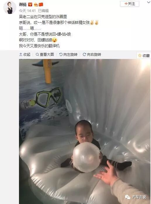 本日谢楠晒出吴二,老二坐在贝壳造型的泳圈里京哥说:哎~~是不是很像阿谁神话蚌精女孩,呃……嗯……年老,你是不是想说田螺女士 啊对对对,田螺女士我本日又是康乐的翻译机#吴京