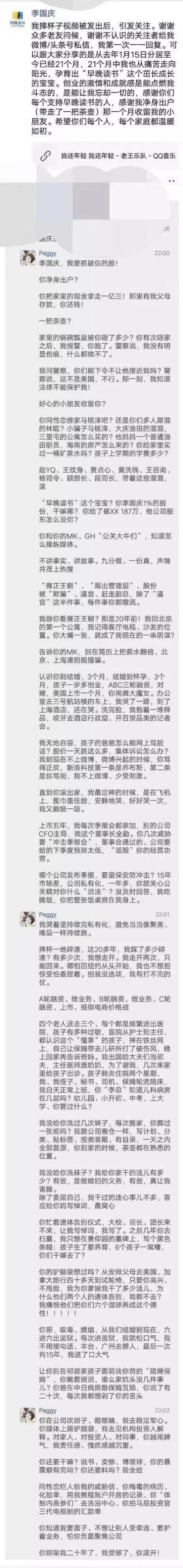 在这张当当网联合创始人俞渝回复老公李国庆的微信朋友圈截图里,俞渝连发四条回复,回应李国庆最近在媒体上对俞渝的公开控诉和指责。她称李国庆并不是净身出户,而是从家里拿走了一亿三,这其中有俞渝和其父母的存款。并指出李国庆联合公关操纵媒体,每件事都在撒谎。