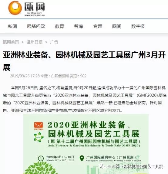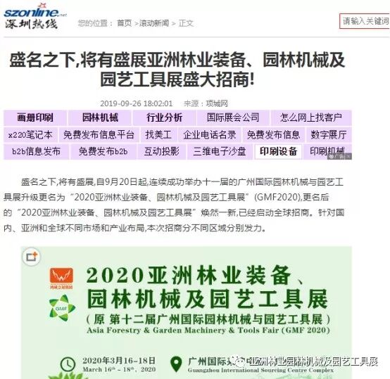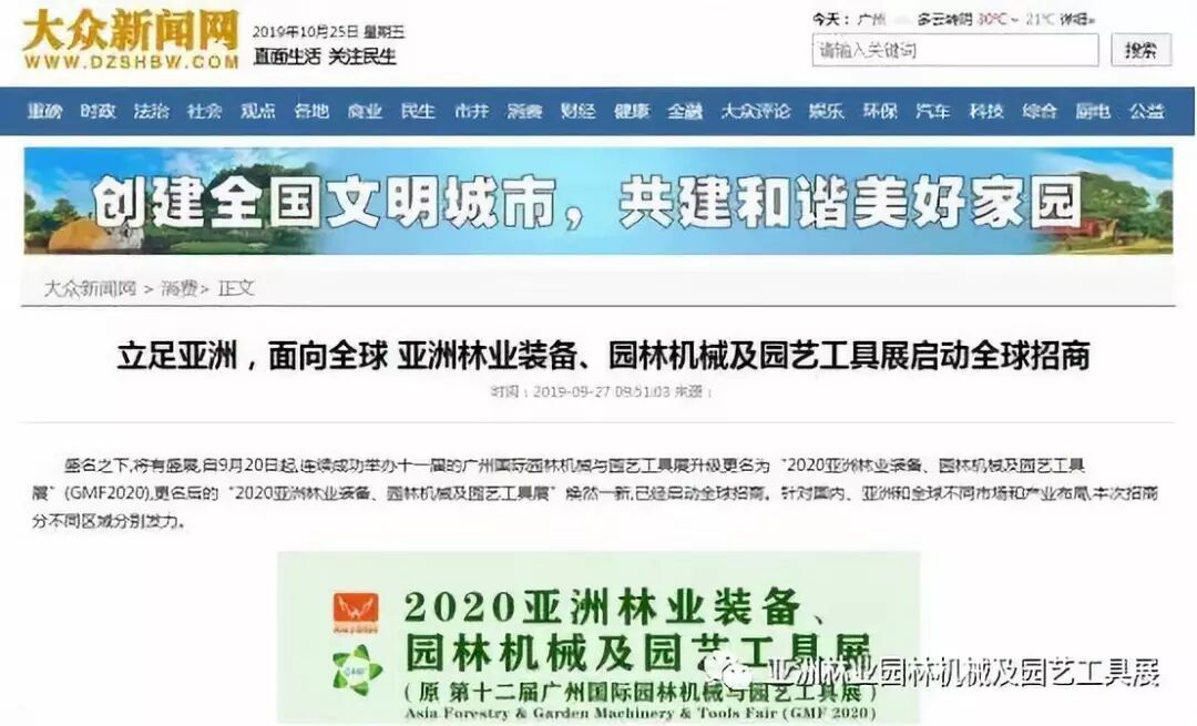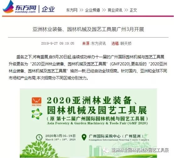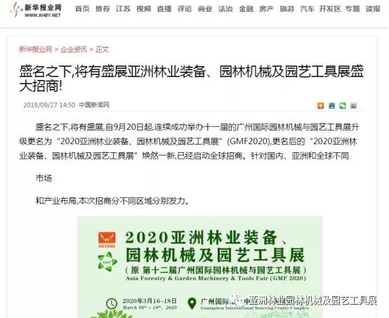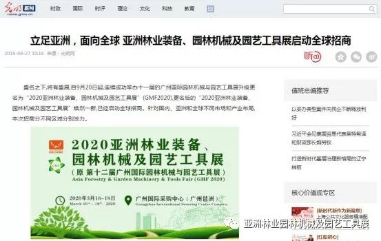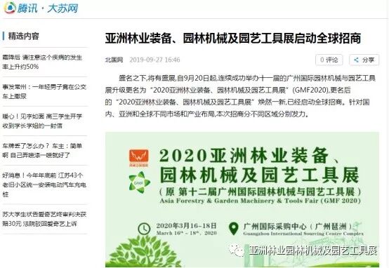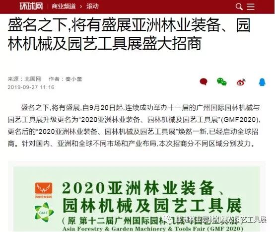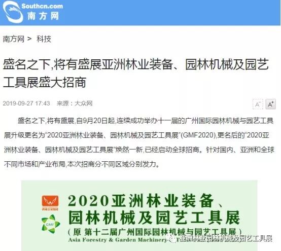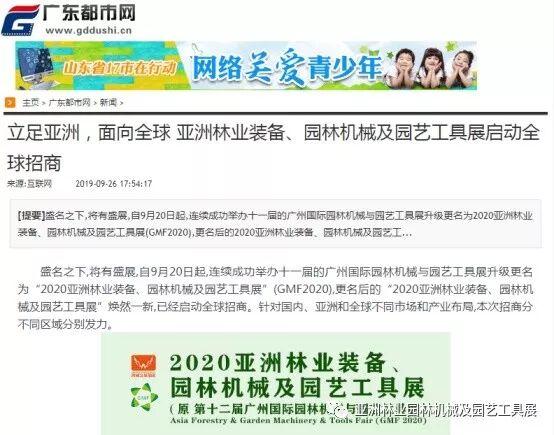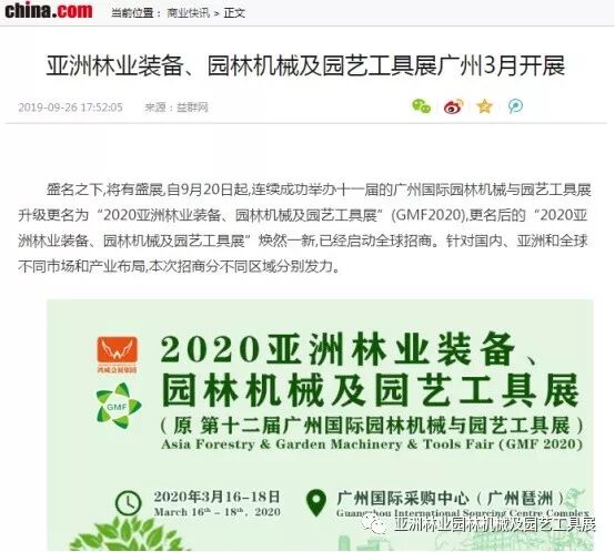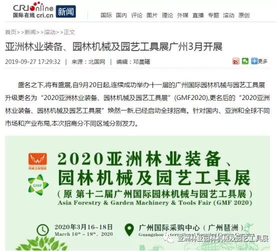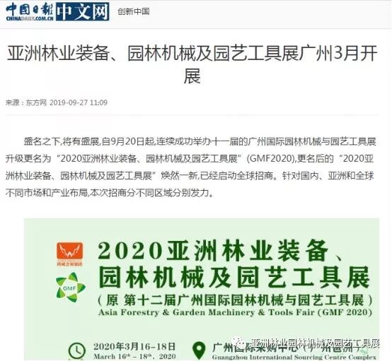 自2019年9月20日起,成功连续举办十一届的广州国际园林机械与园艺工具展正式升级更名为“2020亚洲林业装备、园林机械及园艺工具展”(GMF2020),并同时启动全球招商。此等盛事得到了中国日报网、南方网、环球网、人民网、网易新闻、腾讯网、新华报业网、新浪网、广东都市网、搜狐网、新浪网、凤凰网、新华网等300多家主流媒体的关注报道。相信在2020年3月,焕然一新的“2020亚洲林业装备、园林机械及园艺工具展”将会以更大的规模、更专业的水准给我们带来更为精彩纷呈的展览与活动,再创专业观展人数新高!以下是部分媒体报道截选: