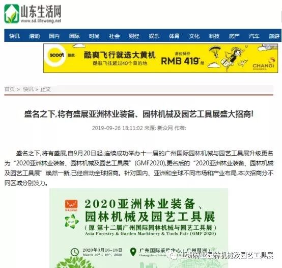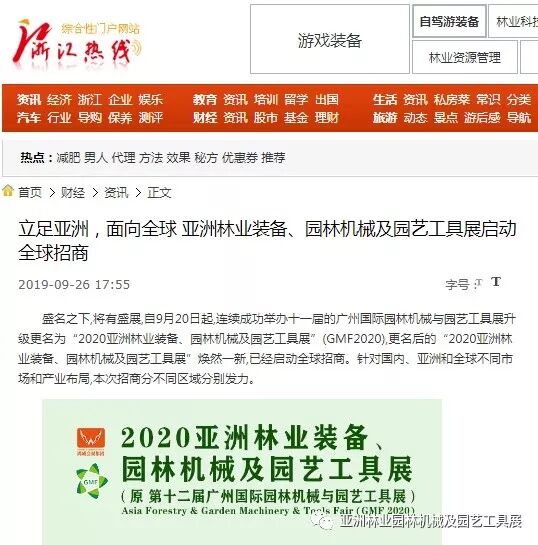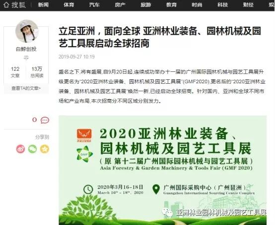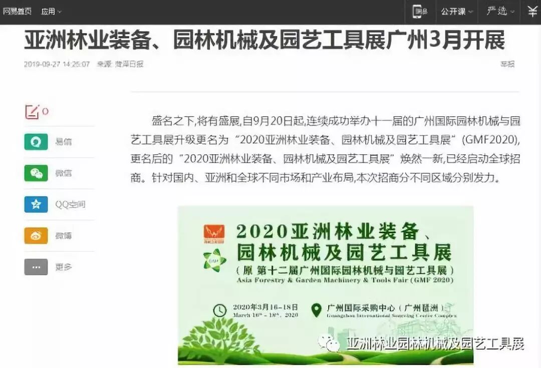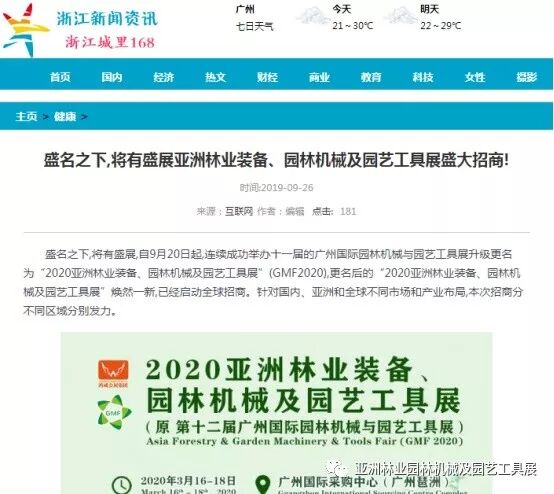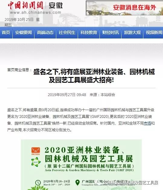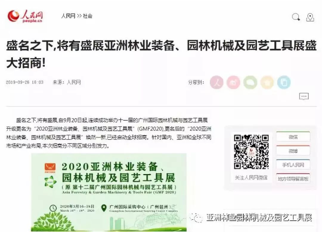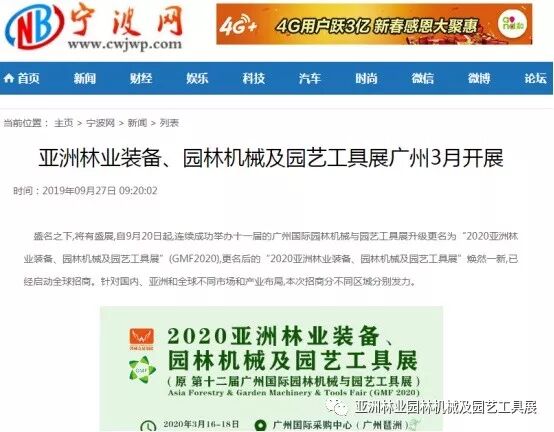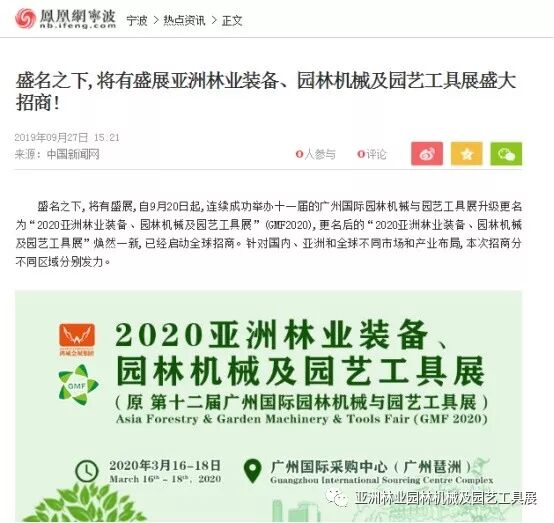 自2019年9月20日起,成功连续举办十一届的广州国际园林机械与园艺工具展正式升级更名为“2020亚洲林业装备、园林机械及园艺工具展”(GMF2020),并同时启动全球招商。此等盛事得到了中国日报网、南方网、环球网、人民网、网易新闻、腾讯网、新华报业网、新浪网、广东都市网、搜狐网、新浪网、凤凰网、新华网等300多家主流媒体的关注报道。相信在2020年3月,焕然一新的“2020亚洲林业装备、园林机械及园艺工具展”将会以更大的规模、更专业的水准给我们带来更为精彩纷呈的展览与活动,再创专业观展人数新高!以下是部分媒体报道截选: