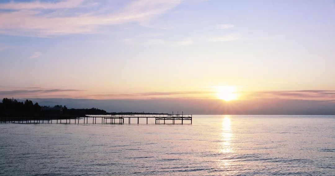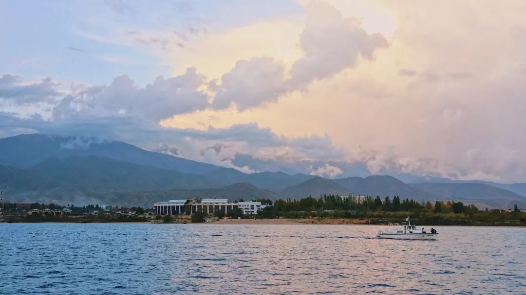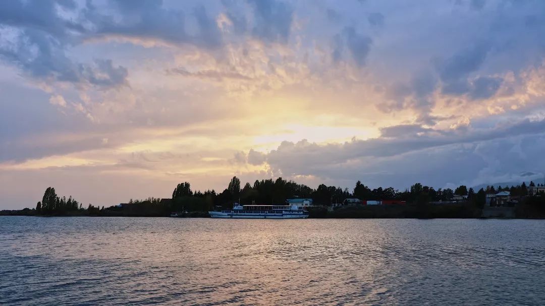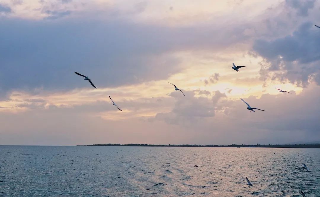 傍晚时分,临近夕阳西下,登上湖边的游船,我便开始泛舟伊塞克湖。太阳用她金黄色的画笔,轻柔地勾勒出云彩清晰的轮廓,船拨开波光粼粼的湖水向湖中心驶去,湖上的水鸟应声而来,盘旋在游船的四周,讨要着船员手中的面包。望着渐渐沉没于地平线的落日美景,我举起了手中的香槟,敬“落霞与孤鹜齐飞,秋水共长天一色”般的湖光山色。