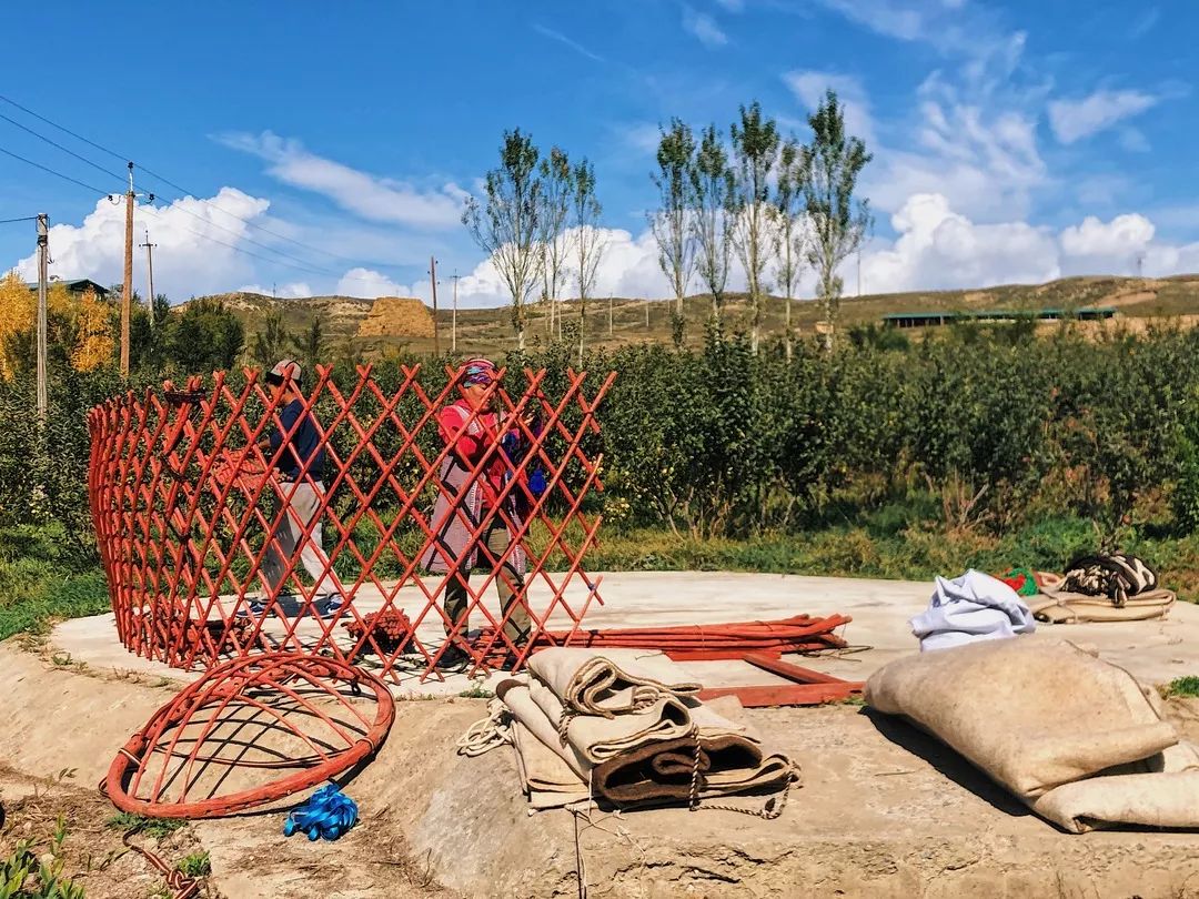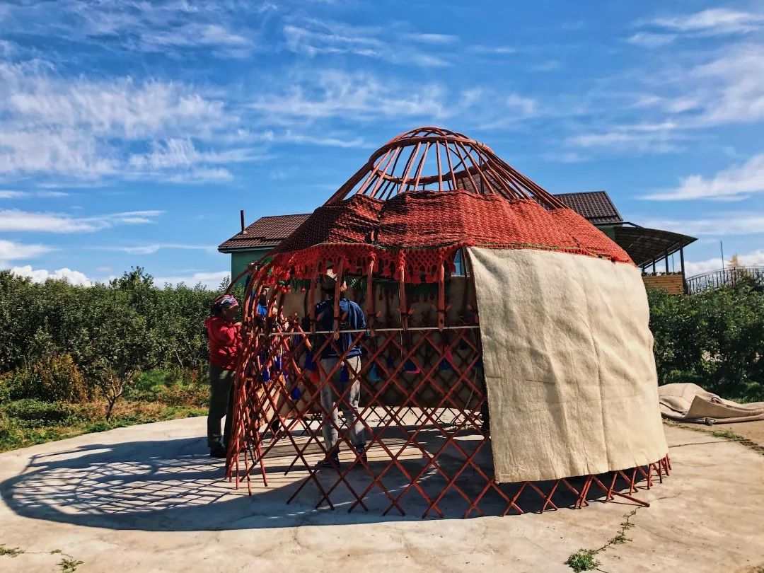 吉尔吉斯斯坦人的心灵手巧在蒙古包的搭建上得到了充分的展示。蒙古包是游牧民族几千年来的移动之家,为了方便随时转移,人们必须掌握快速装搭与拆卸的本事。聪慧的吉尔吉斯斯坦人搭建外壁、固定、装梁、铺外皮、封顶、装饰,忙活得不亦乐乎。这些复杂的工序在他们熟练地操作下稳步进行,仅花费半个小时一个蒙古包便神奇地出现在我面前。