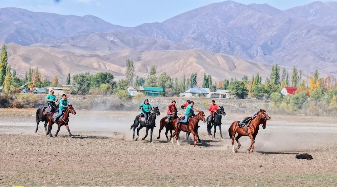 在一望无际的马场,一匹匹骏马在我的眼前呼啸而过。一群吉尔吉斯斯坦的青年骑着他们好胜的骏马正在进行着激烈的比赛,他们共同的目标是一只放在场地中央死去的黑羊。一声令下,骏马如离弦之箭奔腾起来,只见一位快马加鞭的青年俨然一马当先,在即将靠近黑羊时,马儿瞬间减慢速度,身手矫捷的青年身轻如燕,仅用单腿固定在马鞍之上,娴熟地倒挂自己身体去捡拾黑羊,整个过程一气呵成,人马之间的配合已然炉火纯青。此后的“马上摔跤”,竞速赛跑等项目同样精彩纷呈,引得阵阵喝彩。