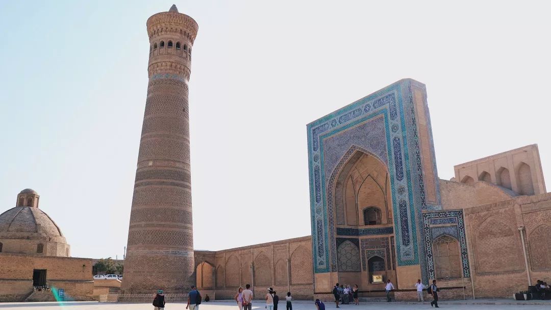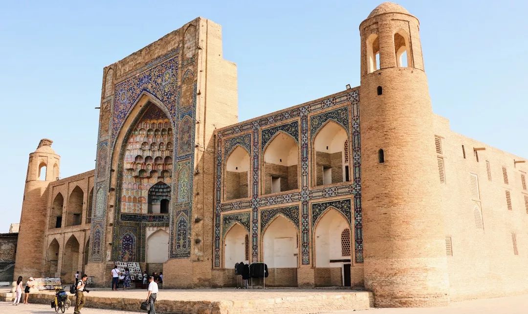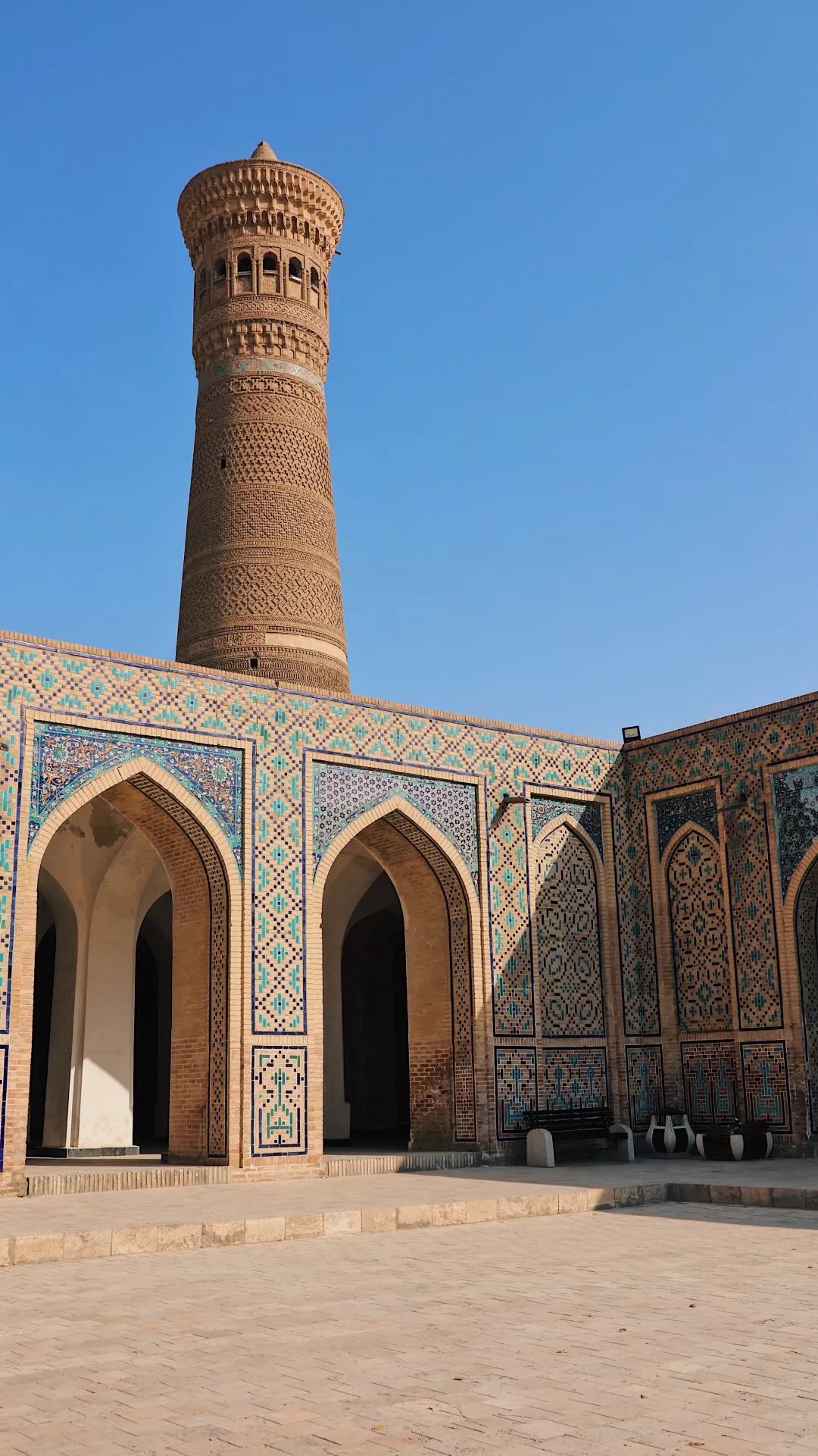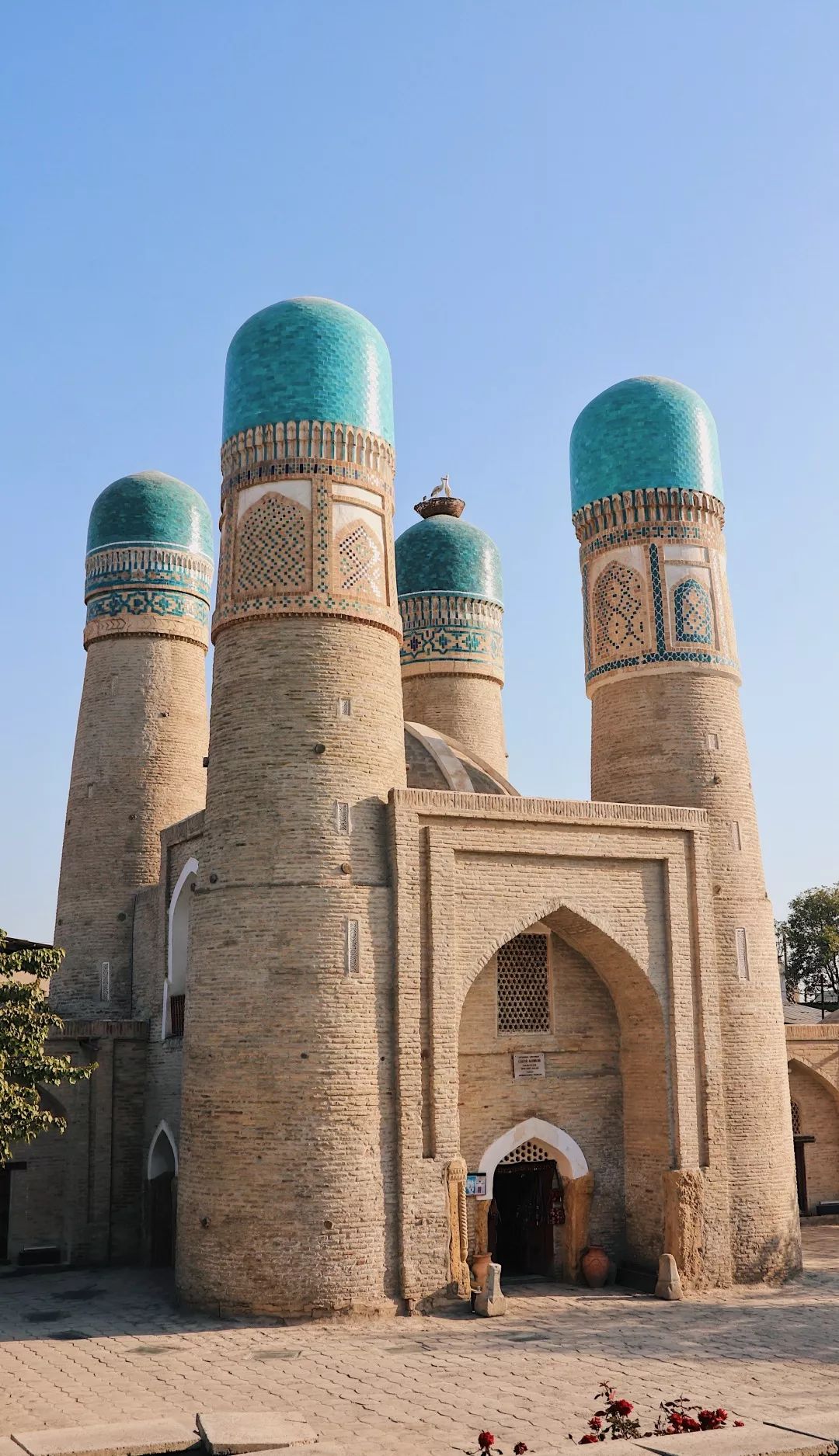 布哈拉的古建筑多分布在老城区,星罗棋布地或矗立在宽阔的广场里,或藏匿于狭窄的小巷中,当我沿着厚重的石板路在古城中踱步,天蓝色圆顶的清真寺、纹饰多样的宣礼塔与规模宏大的神学院仿佛低吟着,向我诉说着穿越千年的故事。