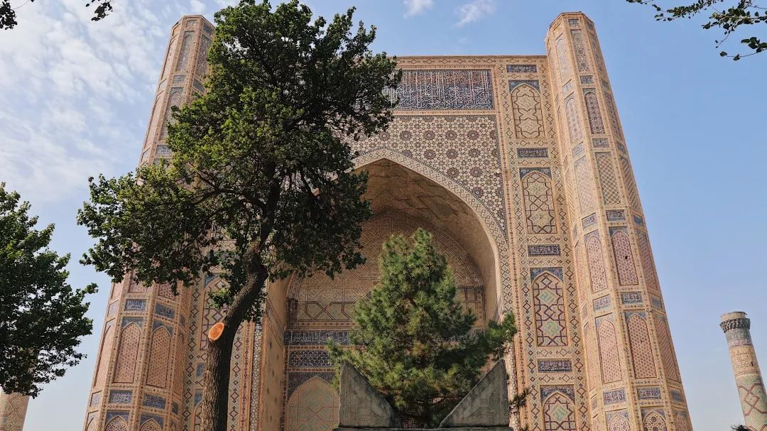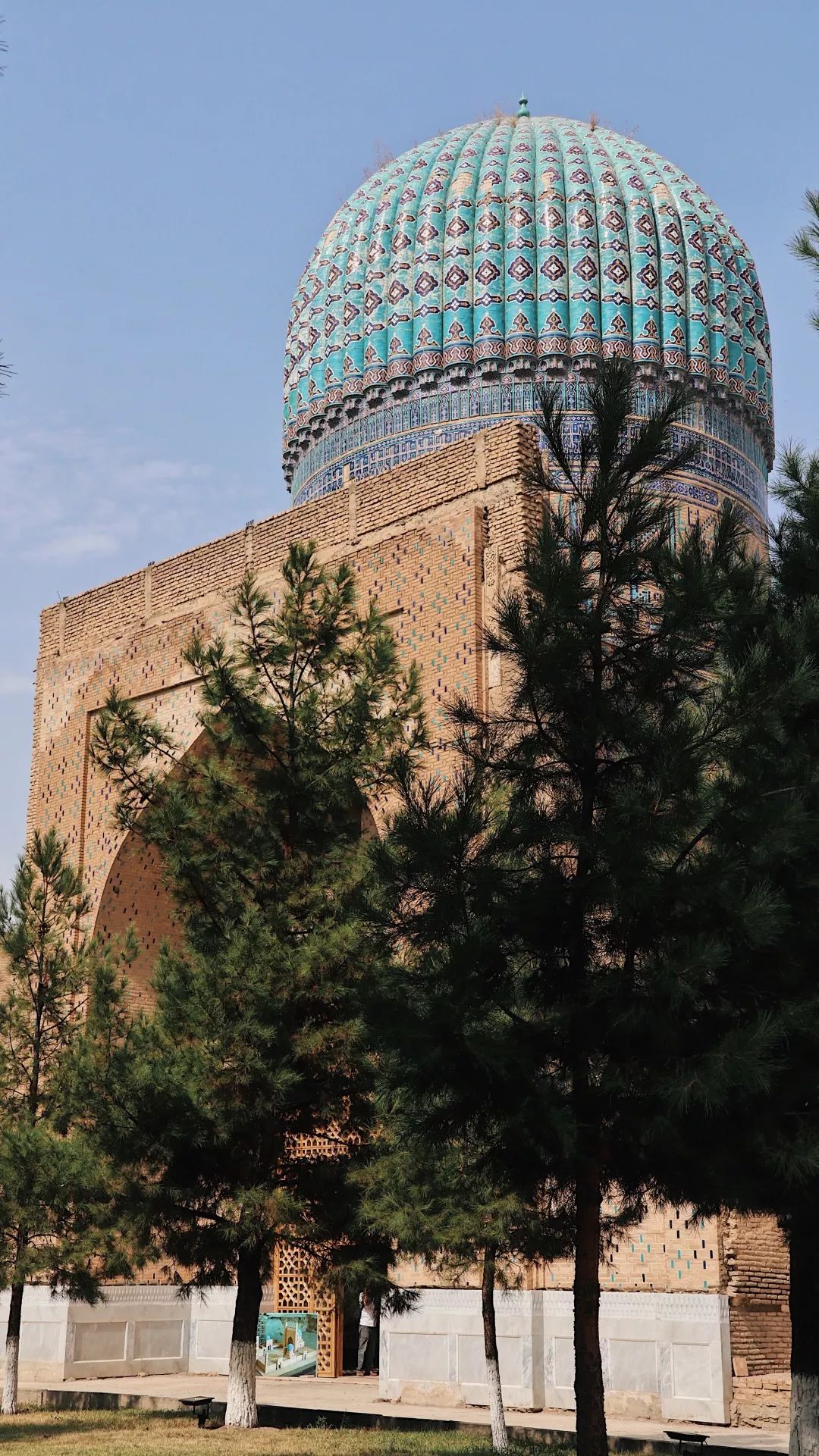 在列吉斯坦的东北方有一座异常高耸的建筑,当属帖木尔帝国的另一建筑瑰宝——比比哈努姆清真寺。我仰望这座一度是伊斯兰世界最大的清真寺,敬畏之情油然而生。它高达惊人的41米,建筑主立面的各个墙体部分拥有风格迥异的装饰,并严格对称,精细的纹路显示出工匠们的高超技艺与智慧结晶。