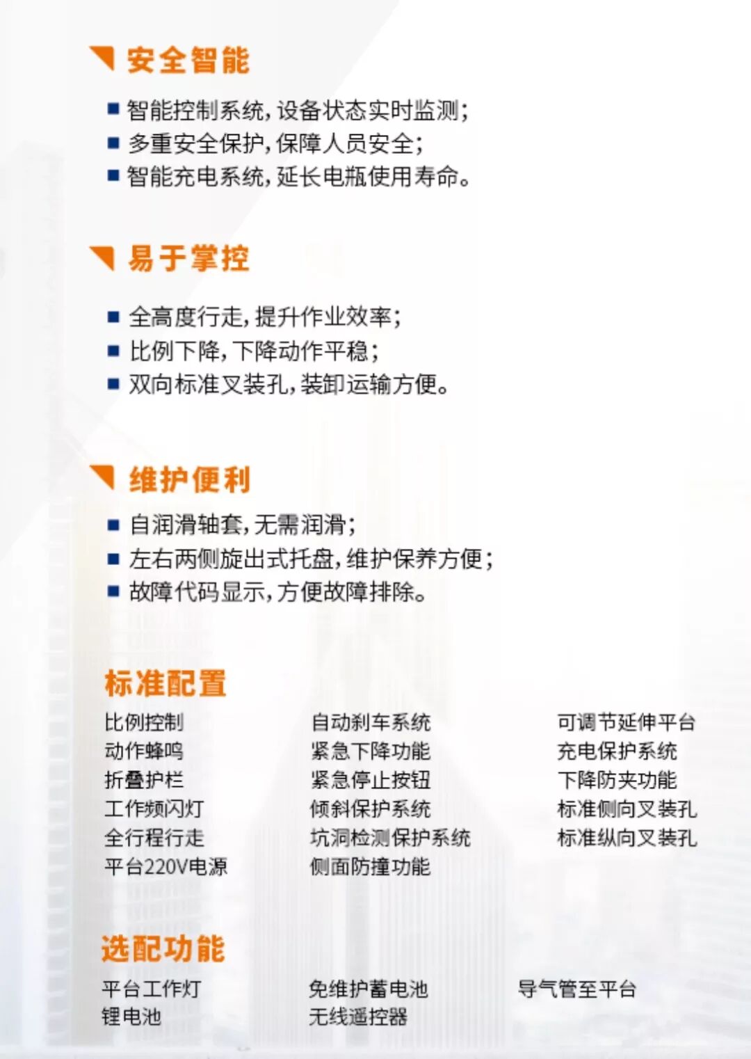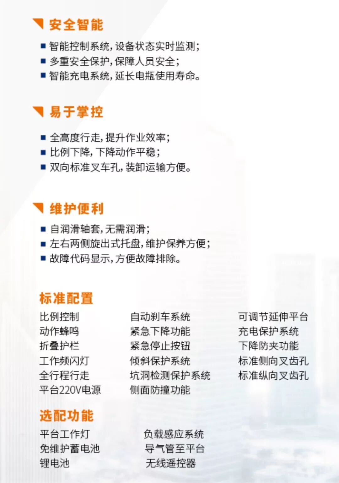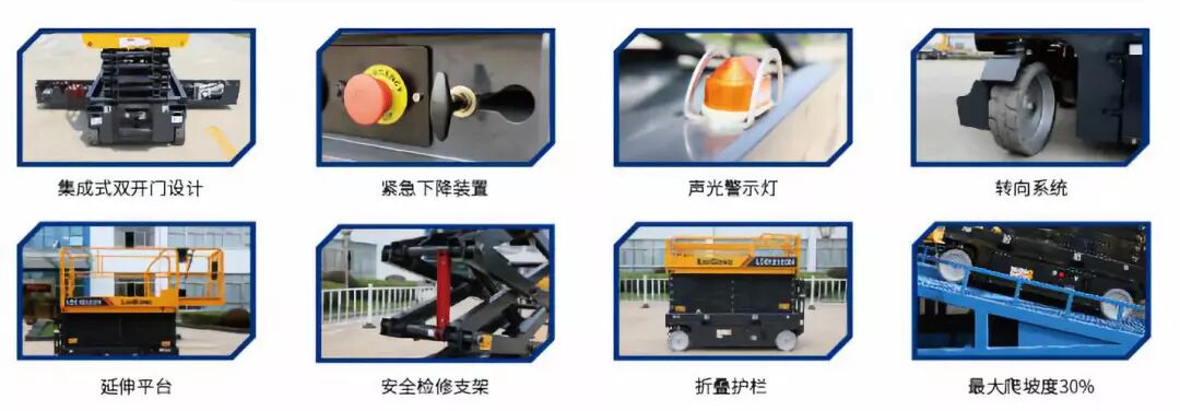 其紧凑的结构可以在狭窄空间灵活应用,续航能力可以高出同行业5%以上;可延伸平台工作空间更大采用下降比例阀控制技术,下降过程无冲击抖动;侧面标准插齿孔设计,装卸运输方便;左右两侧旋出式托盘设计,维护保养方便。全新柳工D系列臂车产品配置多种安全保护和预判断装置,能够让客户在更高的高度,自信从容地操控。