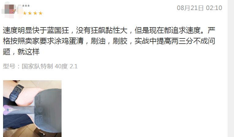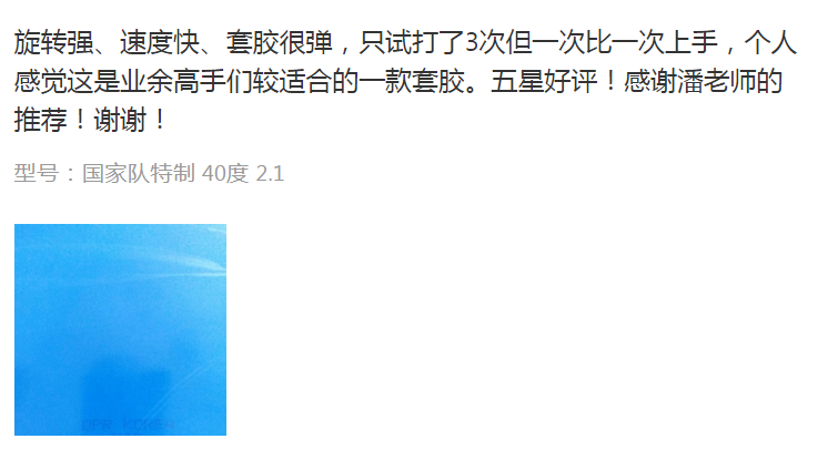 同时老潘已经把此套胶给众多专业和业余高手测试过,都觉得不错,拉球 球很实,不虚,同时弧线会比狂飙低很多,但是旋转仍在,速度并存!个人感觉如果给旋转、速度加一个数值,10分满分,两者可以达到7.5 7.5,对比国产主流套胶打分的话,旋转是8.5 速度是4.5(没灌胶水)!或者给某日本知名品牌涩套打分的话,旋转是4.5 速度是8.5!估计大家看了就明白这个朝鲜国家队特供蓝海绵国套的独特之处了,综合性极强!下面是经过一段时间推广的反馈截图: