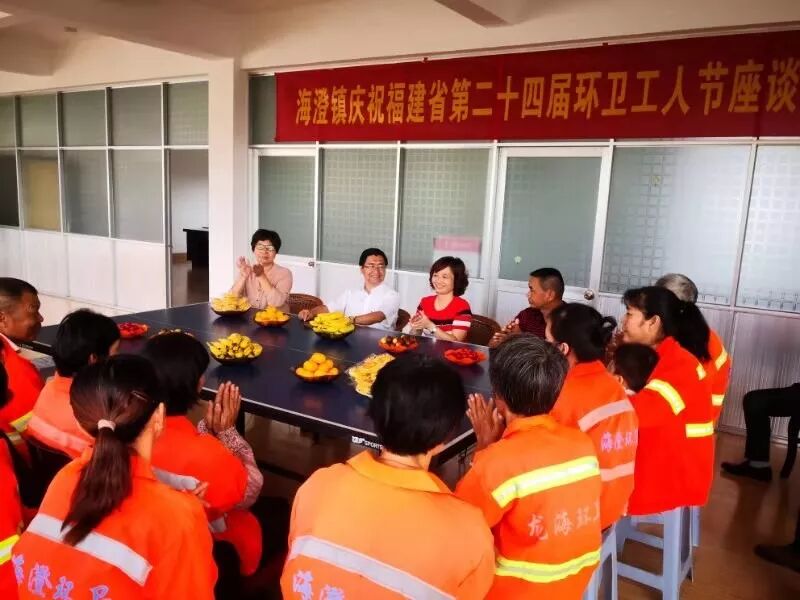 25日,在全省第24届环卫工人节到来之际,海澄镇主要领导和几十位一线环卫工人代表在辖内环卫所共聚一堂,大家畅所欲言,交流看法,为环卫事业发展献计献策,进一步结合“不忘初心、牢记使命”主题教育活动内容,营造关爱、尊重环卫工人的氛围。