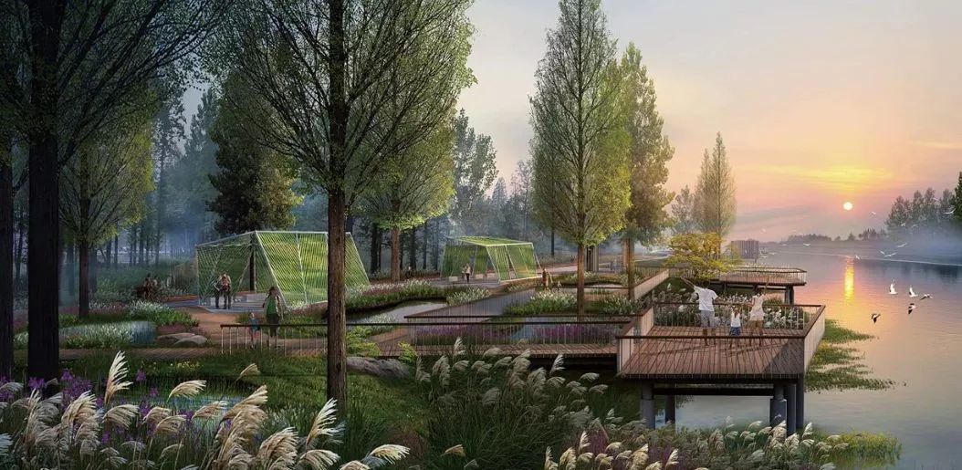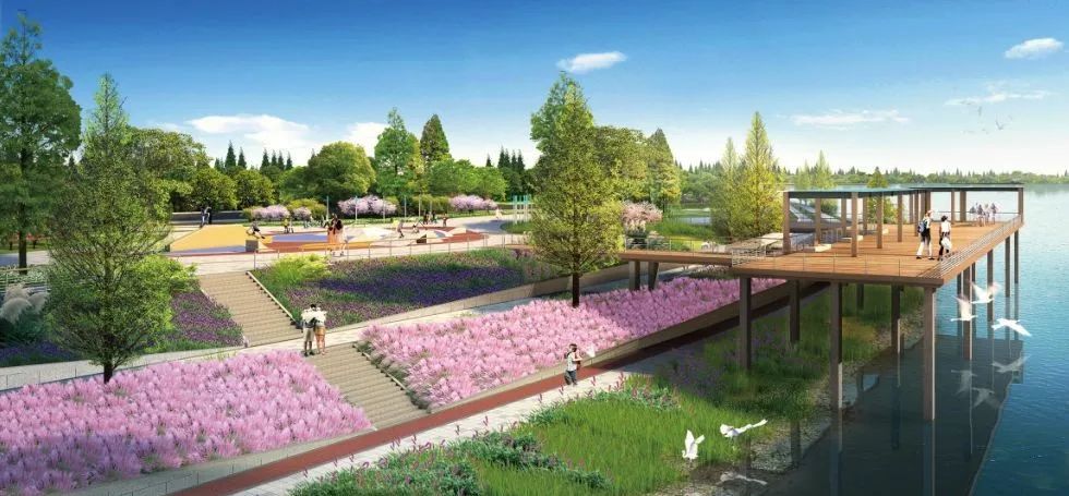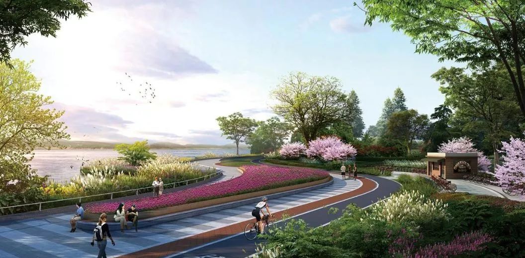 江景视野开阔将打造植物花海、沙洲文化主题区以滨水步道、自行车道串联景观形成序列景观带