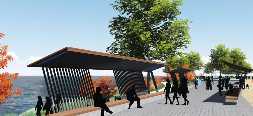 离航运集市广场不远处特意设置了多个风雨亭外形恰似一艘艘行驶在富春江上的船未来将成为市民休闲的好去处