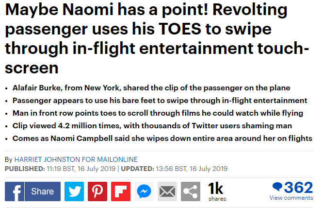 在飞机上,“你摸到的每样东西都很脏!”