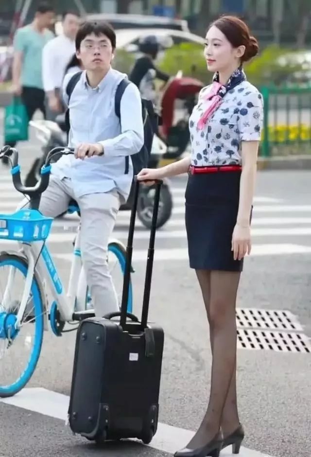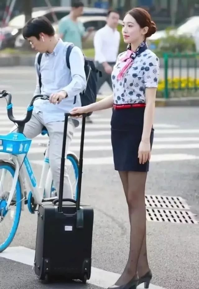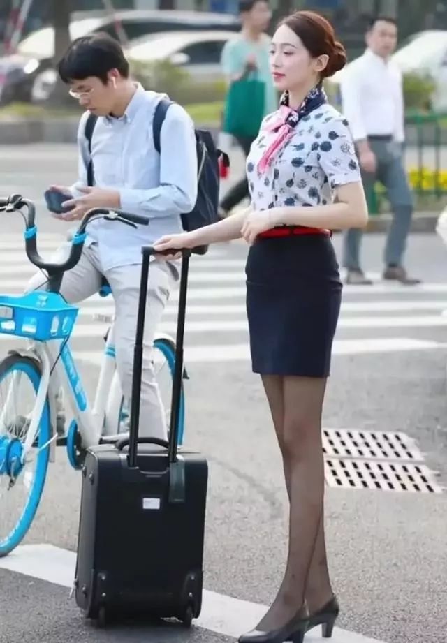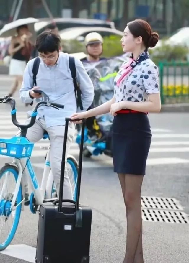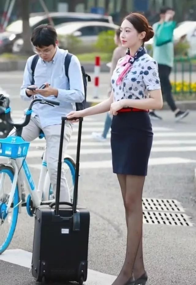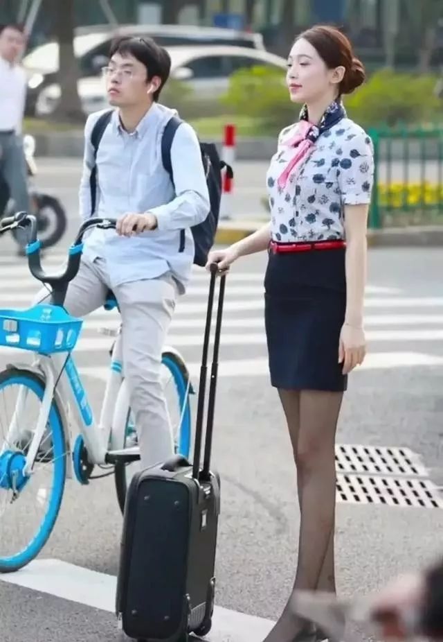 在大街上看到穿空姐服这么好看的人,旁边骑自行车的这位直男眼神都亮了,一直盯着小姐姐看,仔细观察的话,你还会发现小姐姐穿了一条很薄的黑色丝袜,因为材质太薄,所以可以看见里面的肉。