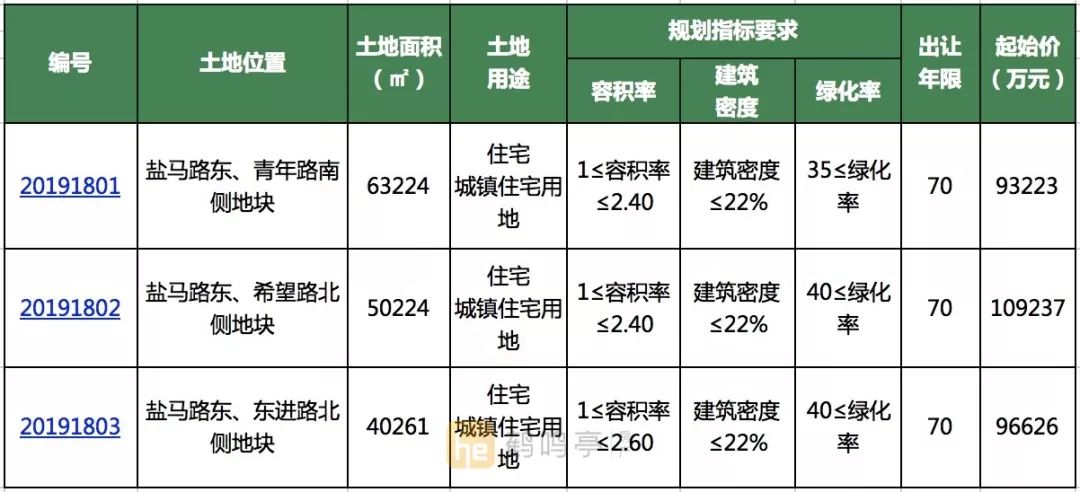 经盐城市人民政府批准,盐城市自然资源和规划局决定以挂牌方式出让3(幅)地块的国有土地使用权。20191801地块位置:盐马路东、青年路南侧,土地面积63224㎡;20191802地块位置:盐马路东、希望路北侧地块,面积50224㎡;20191803地块位置:盐马路东、东进路北侧地块,面积40261㎡。现将有关事项公告如下: