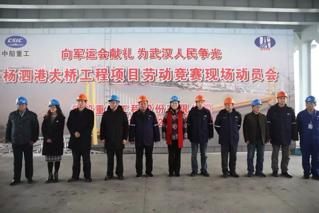武船重工股份先后在杨泗港大桥上开展了“献礼十九大 大战120天”专项劳动竞赛、联合武汉市总工会开展了“当好主人翁 建功新时代”劳动竞赛活动,先后创下了“单个项目单日发运5100吨”“36天完成全桥节段吊装”等新纪录。