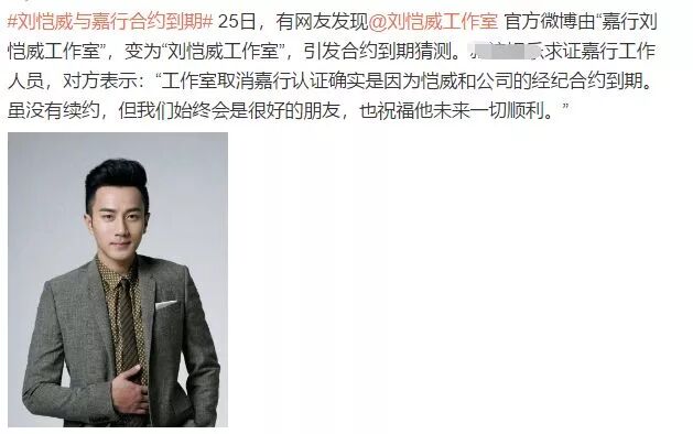 就在10月25日,刘恺威工作室账号由原本的“嘉行刘恺威工作室”变更成为“刘恺威工作室”,对此有媒体致电嘉行方面,得到回应,现在刘恺威和嘉行之间的经纪合约已经到期,而且双方没有续约,因此取消了嘉行认证。同时嘉行方面还表示,虽然没有续约,但双方依然是非常好的朋友,祝他一路顺利。