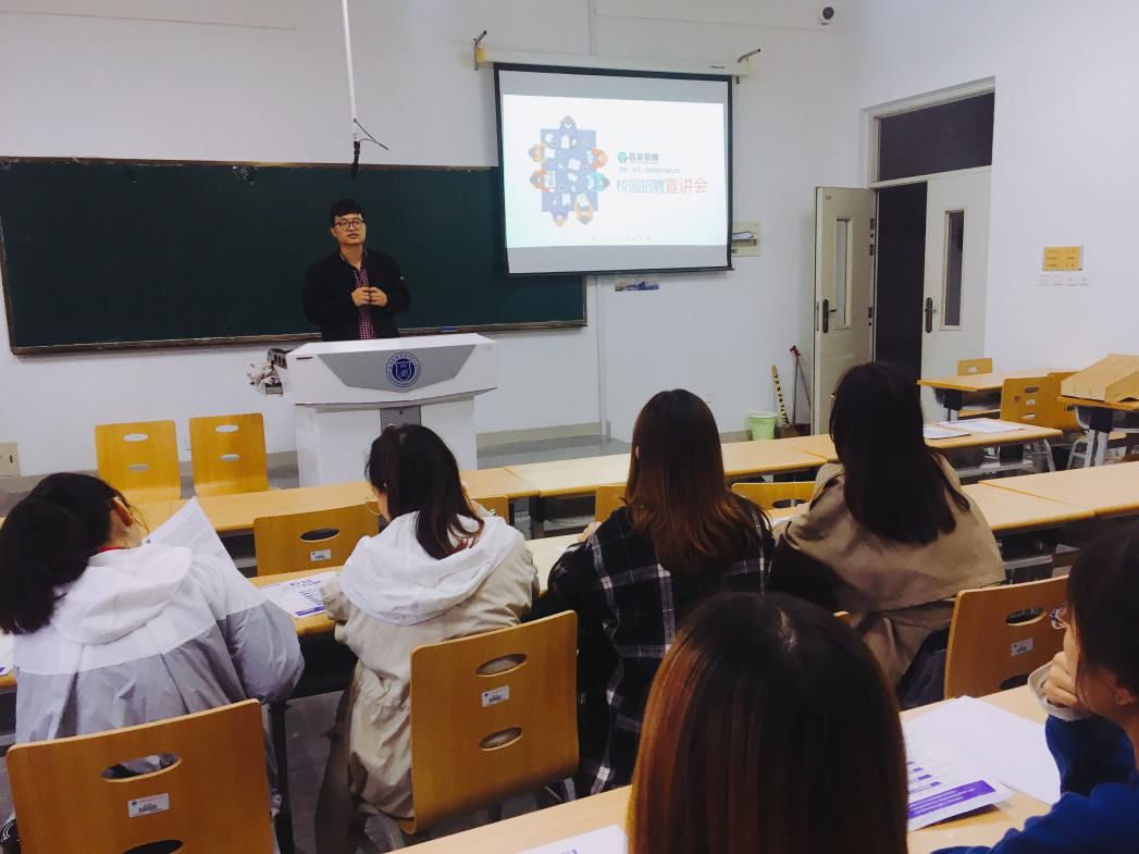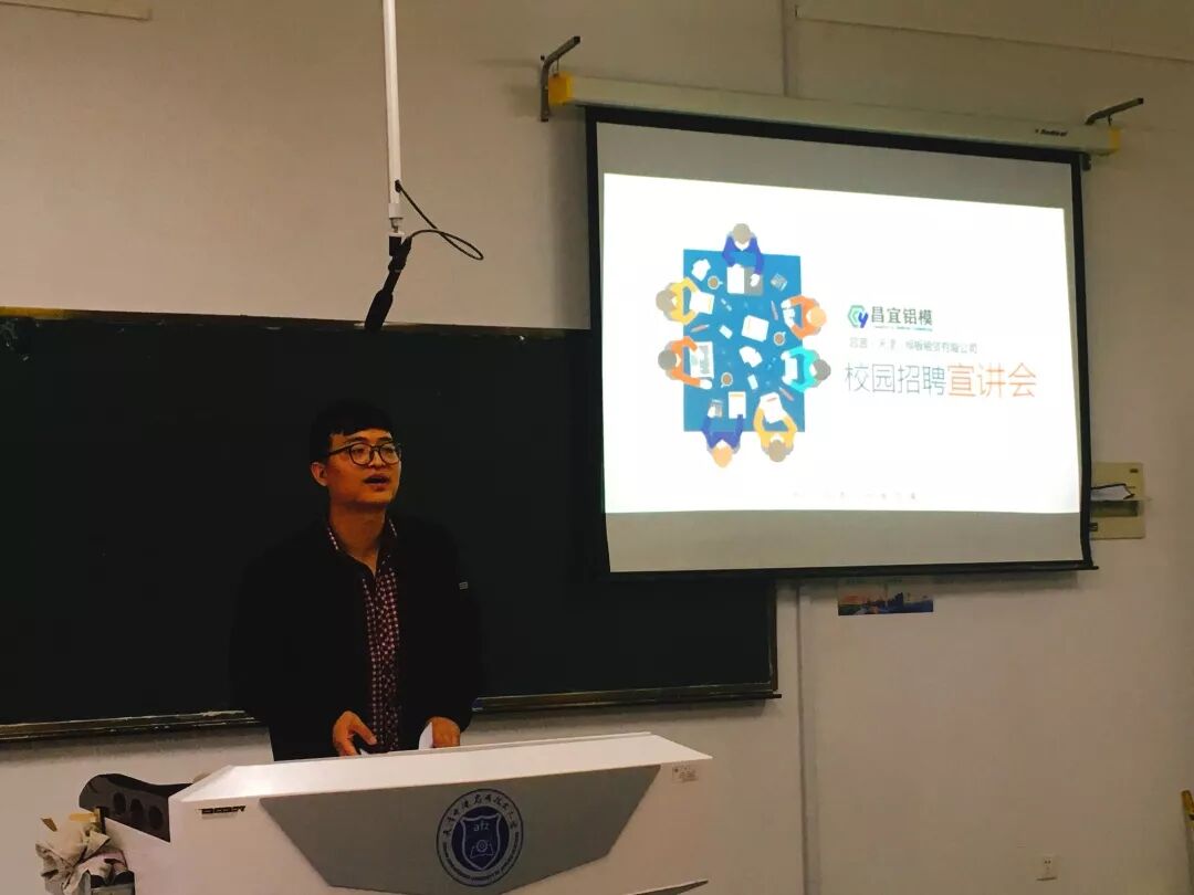 昌宜(天津)模板租赁有限公司的张曦先生通过一个宣传片向在场的学生对企业进行了介绍,随后张先生从公司简介、产品业务、组织结构、薪资待遇、以及岗位要求等方面进行了讲解与交流。