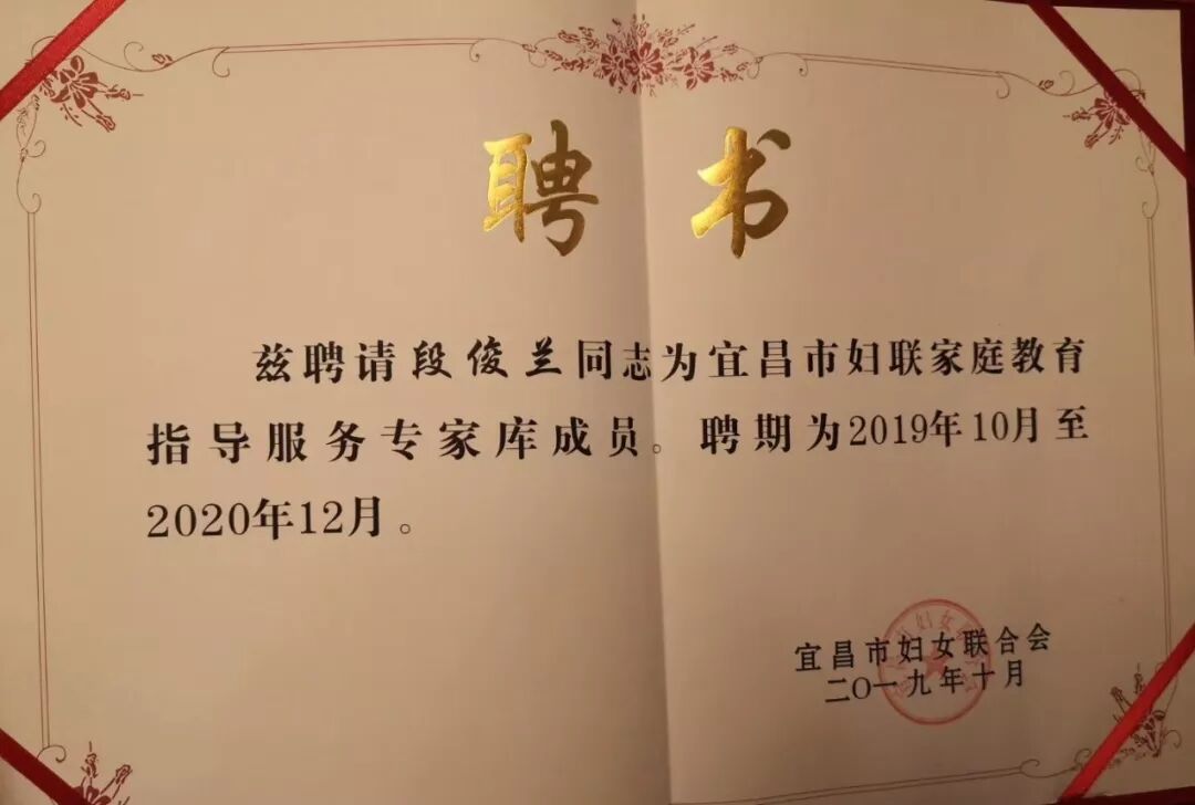 今年8月,宜昌市妇联面向全市下发了选聘宜昌市家庭教育指导服务专家库成员的通知,各地妇联择优推荐,市妇联经过资料审核、评委评议,决定聘任段俊兰等22人为宜昌市妇联家庭教育指导服务专家库成员,聘期为2019年10月至2020年12月。当天的开班仪式上,市妇联为专家库成员颁发聘书。
