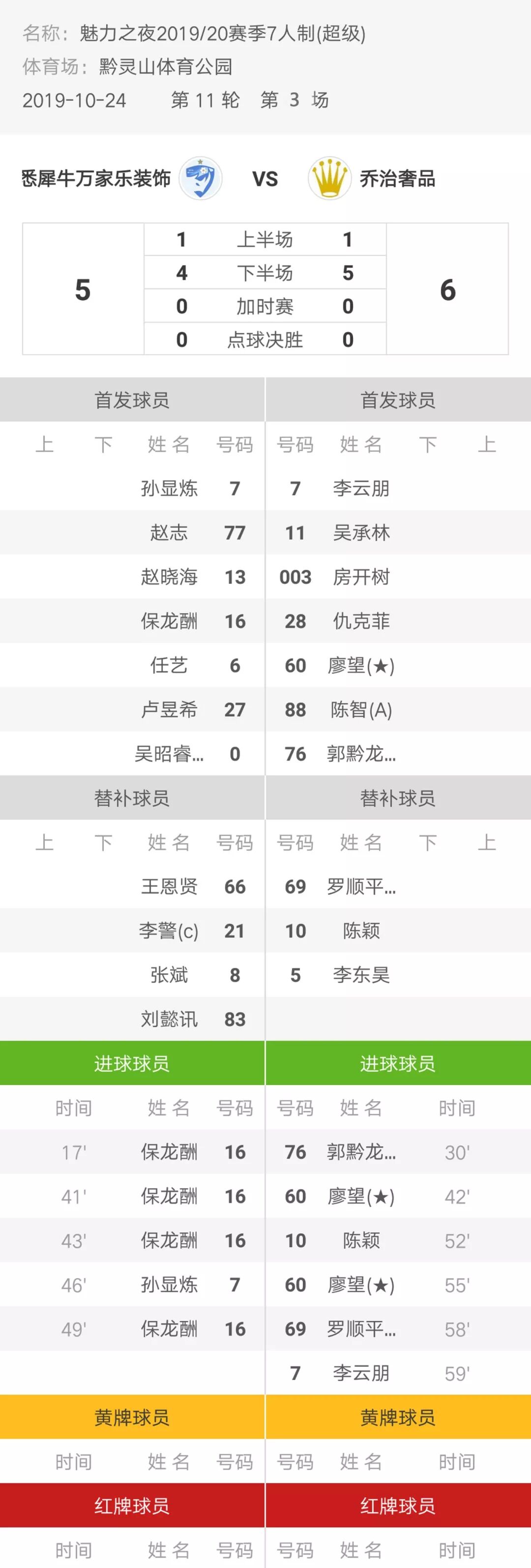 10月24日晚,由贵州省足球协会指导,贵州体育在线主办,黔灵山体育公园、乌当区足球协会协办的魅力之夜2019/20赛季7人制足球联赛(超级组)第十一轮的第三场比赛在黔灵山体育公园进行,万家乐装饰5-6乔治奢品。
