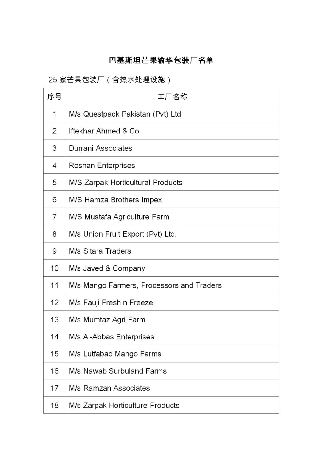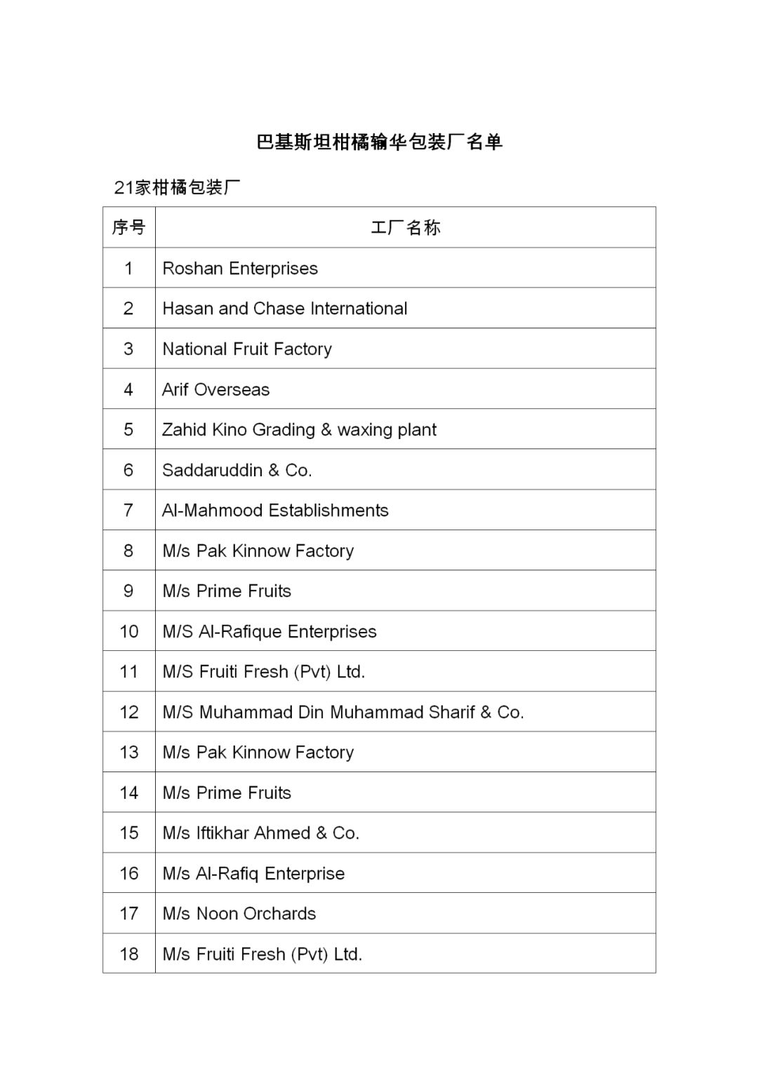 巴基斯坦输华水果注册企业名单