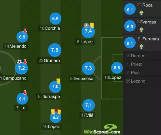 武磊本场触球17次6次丢球权,触球数是西班牙人首发球员中最少的,替补他出场的巴尔加斯在30分钟里比武磊多拿了8次球。