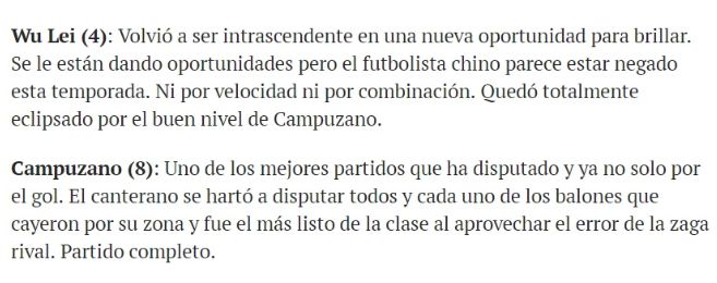 《每日体育报》更是给武磊评分4分!这是全队唯一的4分,排名垫底!《每日体育报》写道:“坎普萨诺的出色表现让武磊黯然失色”。值得一提的是,坎普萨诺获得8分的评分。在《每日体育报》的评分中,主力球员3人不及格,除了5分的迪达克与哈维洛佩斯,武磊的4分格外扎眼。