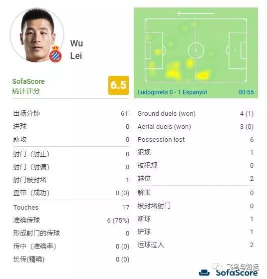 本场比赛出任前锋的武磊射门一次被封堵,17次触球,传球8次6次成功,7次对抗成功1次,丢失球权6次。