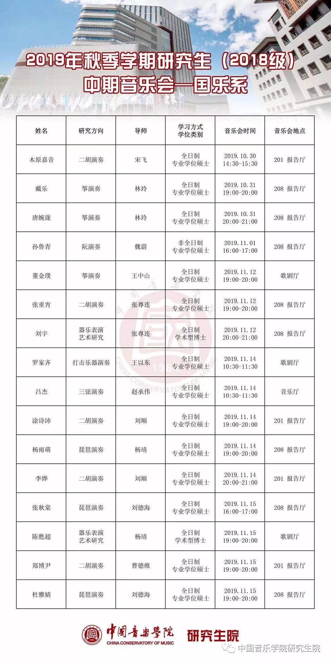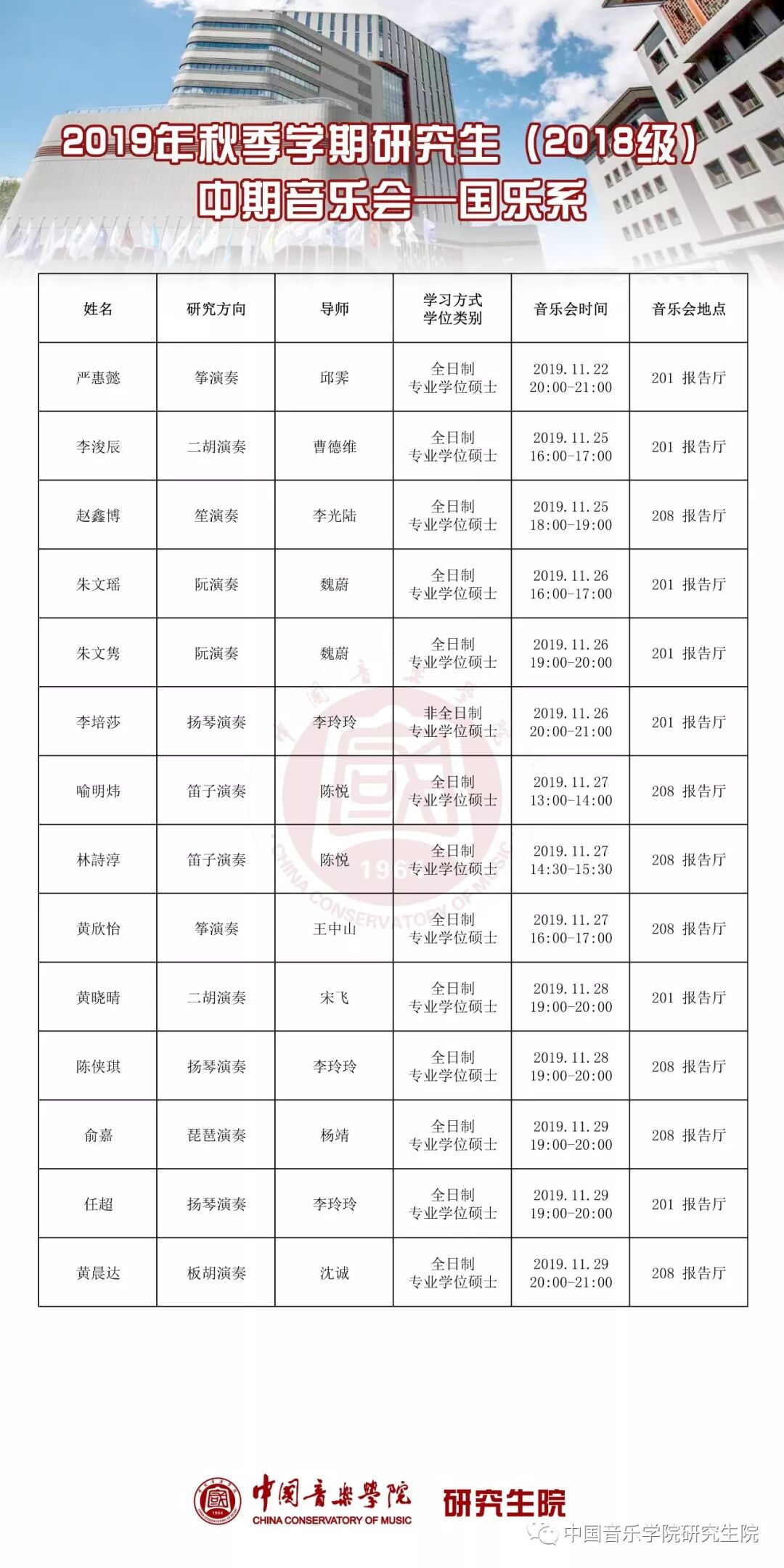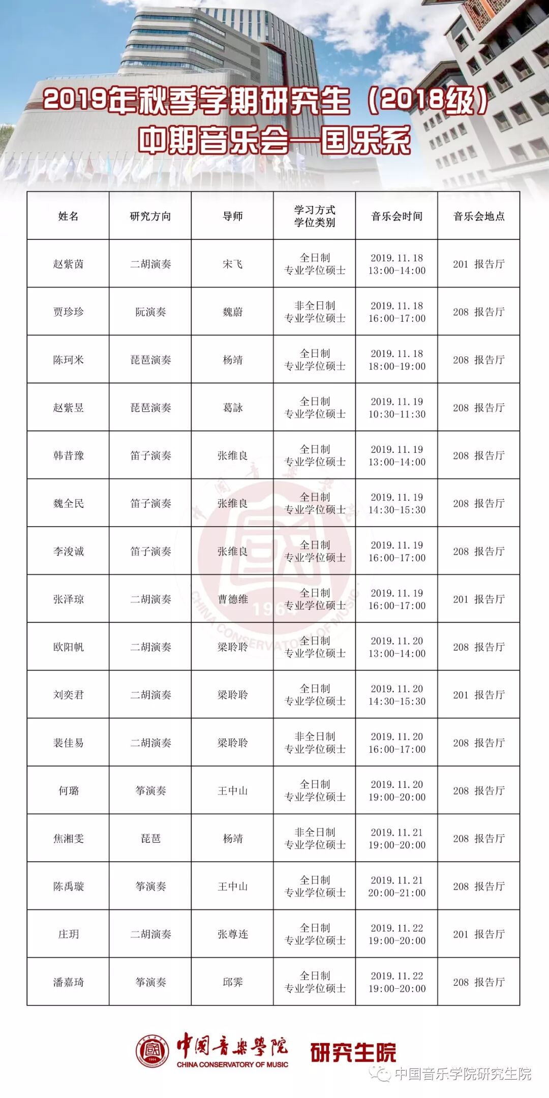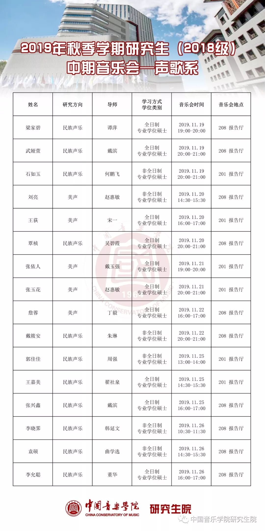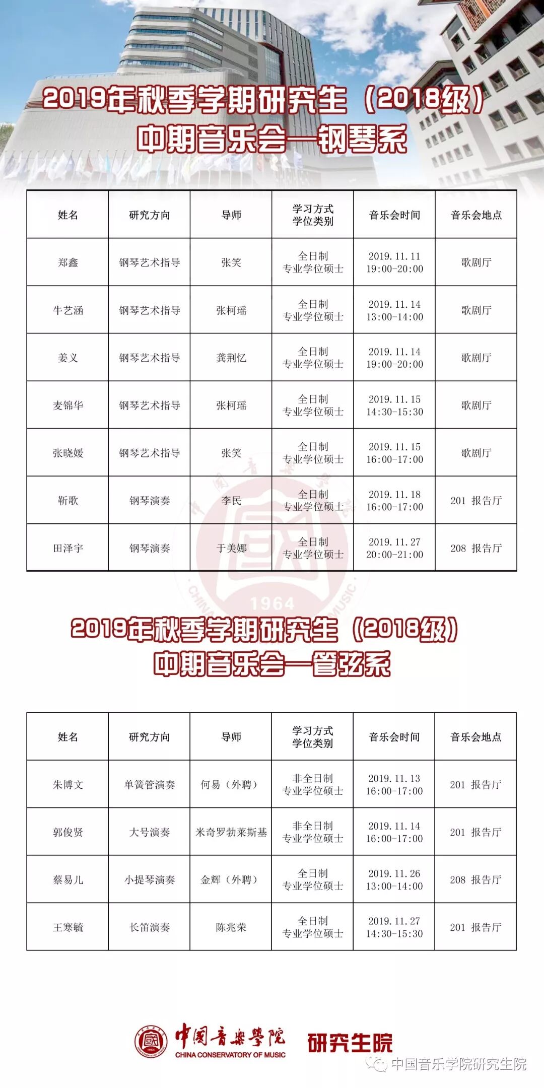中国音乐学院2019年秋季学期研究生(2018级)中期音乐会时间安排