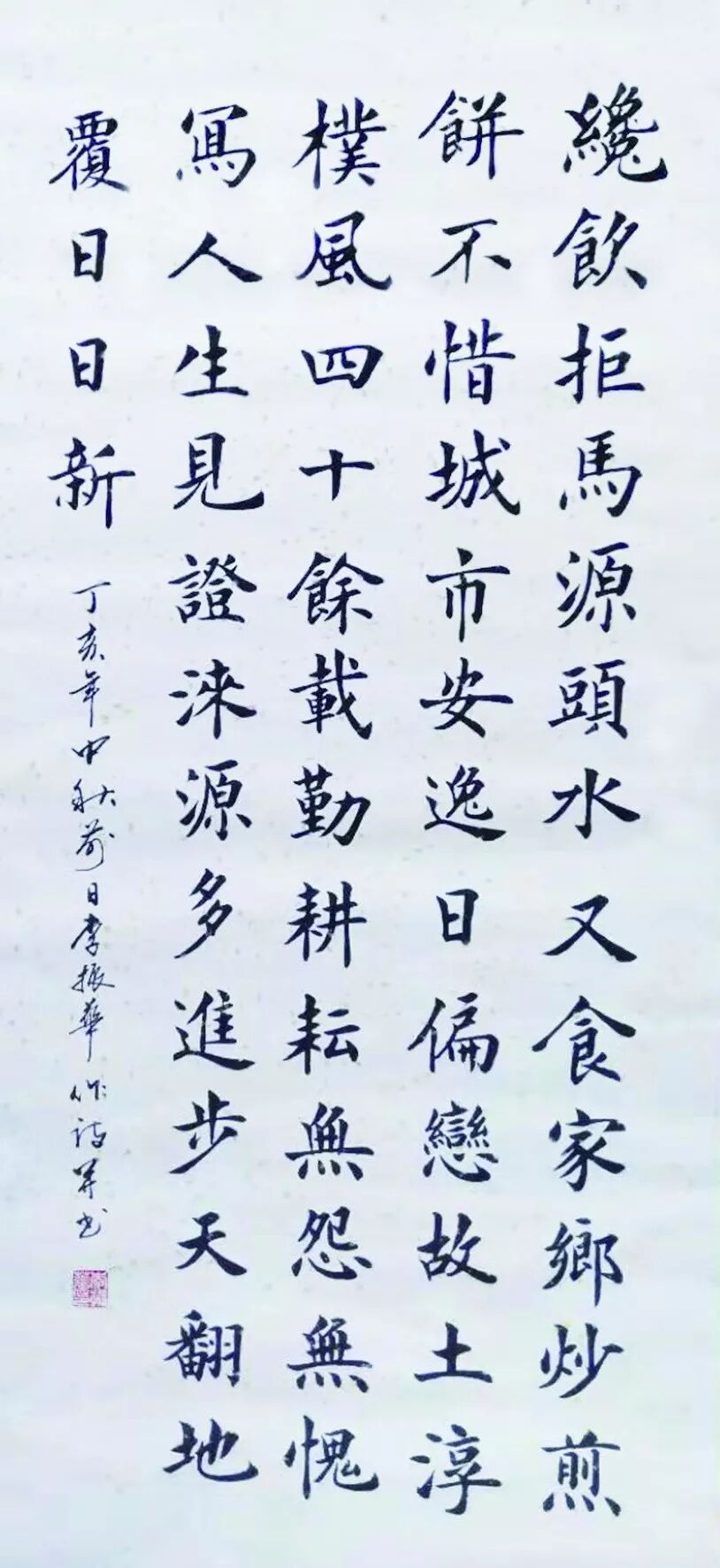 李振华学书是从柳体入帖的,后来到北京中国书画函授大学研习欧阳询与褚遂良的碑帖,在中国书法家培训中心进修专攻小楷。“察之者尚精,拟之者贵似。”他临欧阳询《九成宫醴泉铭》,平正中见奇绝,规矩中见洒脱,谨严有度、章法有致,乃深得其精髓;他临褚遂良《倪宽传赞》,用笔中有变化,劲健中有遒媚,徐疾有态,收放自如,乃顿悟其真味;他以《灵飞经》为范本,兼得“二王”之风神气韵。他的榜书、行书亦各有特点。“察”入于眼,“临”出于手,“创”出于心,因此,他诸体兼擅,楷书尤工,融会百家,自成高格,可谓增减古法、创成今体。