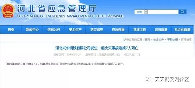 2019年10月24日3时30分,邯郸武安河北兴华钢铁有限公司烧结车间皮带通廊着火造成7人死亡。