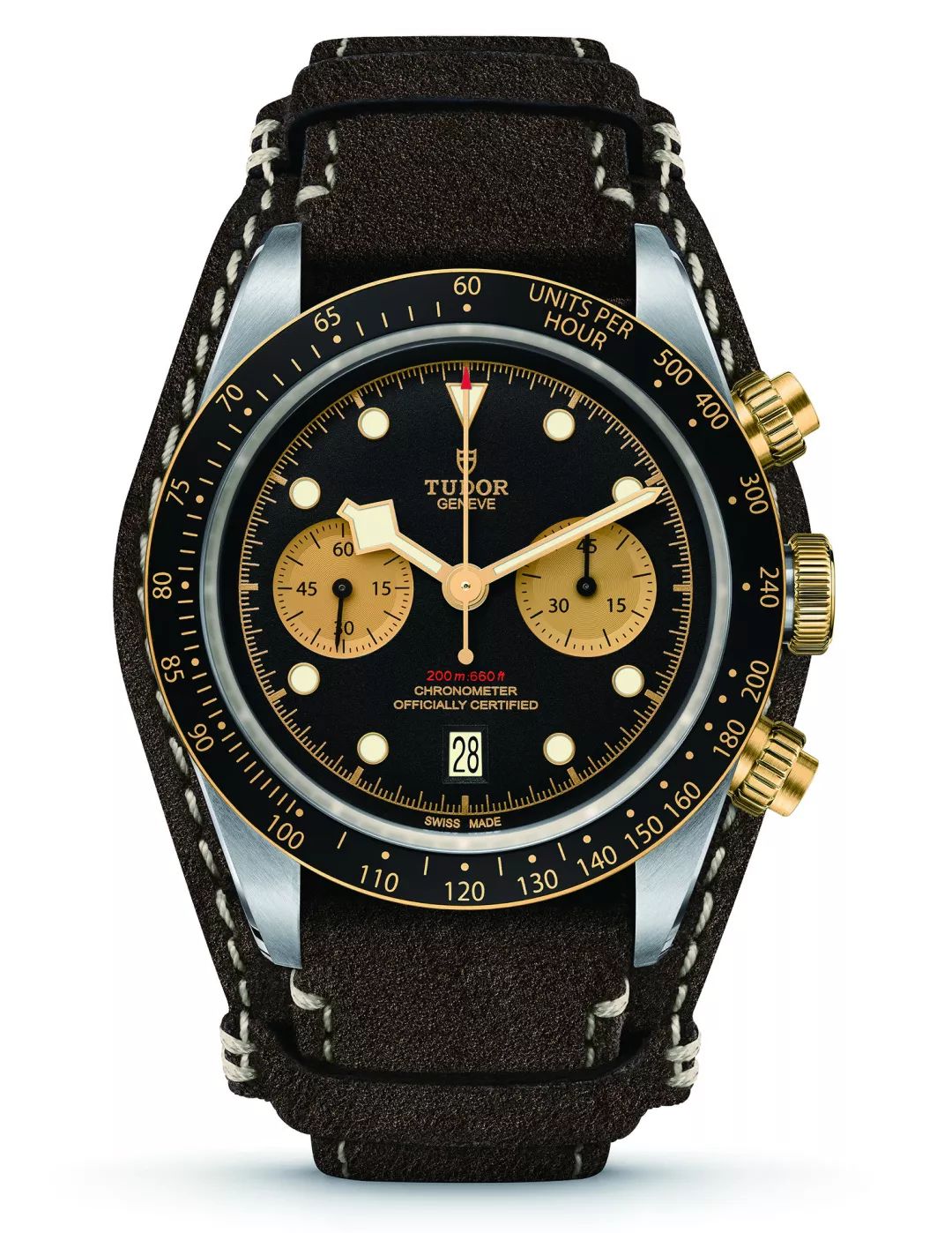 该款腕表同样保留了著名“雪花”指针,其优雅端庄的黄金色调,与圆拱形哑光黑色表盘形成鲜明对比,读时效果更为理想。内凹式计时盘和香槟色的搭配,不仅突出层次感,更营造鲜明而抢眼的对比。腕表的日历窗同样设于6点钟位置,并在充满碧湾特色的41毫米钢表壳外搭配黄金按钮,是以对第一代帝舵计时腕表的灵感回眸。黄金固定外圈搭配黑色阳极氧化铝测速计字圈,兼具运动感与优雅风格,令腕表外观个性十足。