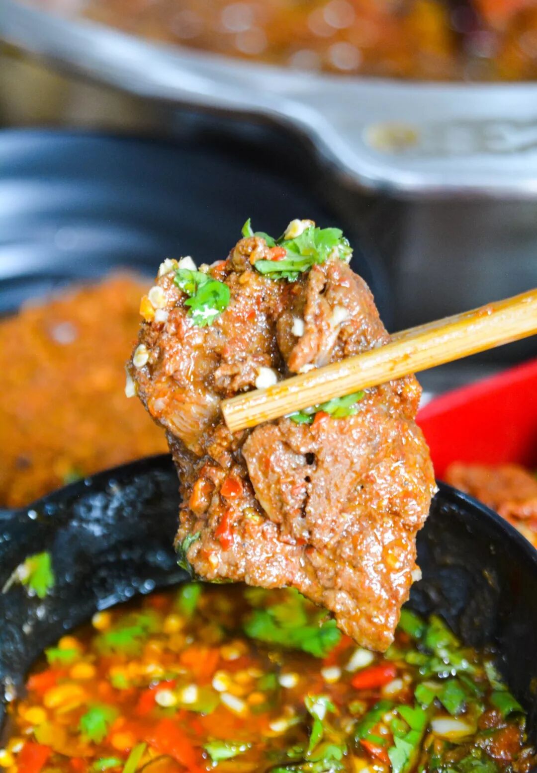 一大把竹签串着,一股脑戳进沸腾的红汤里,拿上来牛肉的香气扑鼻而来,必须大口吃才能过瘾!