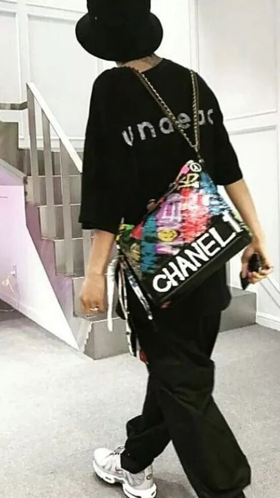 他把Chanel的包包当成了画布,在Gabrielle上随便涂涂画画的估计只有他了,而且由他自己示范穿搭。