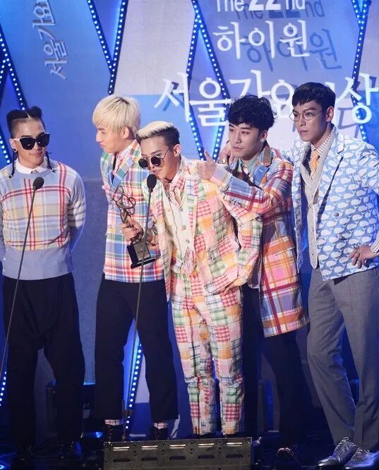 后来,bigbang也有五人合体穿过Thom Browne五彩斑斓格纹西装去领奖,虽然有几个人是相当微妙,但果然还是穿套装才行啊。