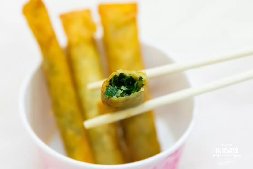 春卷一份四个现点现炸,外皮焦酥薄脆里面包的是韭菜肉馅,一定要趁热吃,美味加倍!
