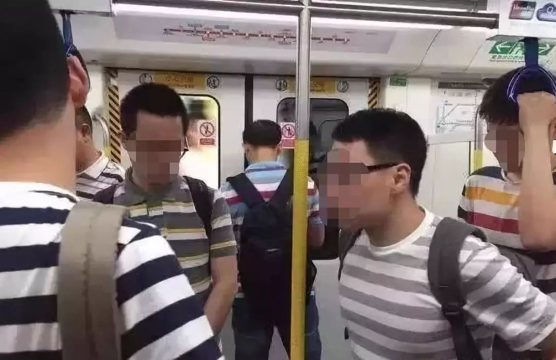 在拥挤的地铁上,直男/平头/双肩包/条文上衣,扎堆而行但是没有女伴,这应该是程序员下班了。