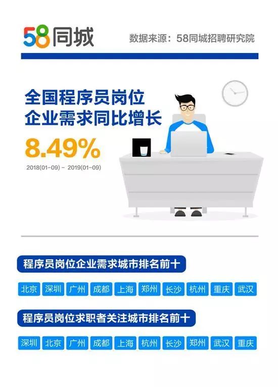 据统计,今年1-9月,全国程序员企业需求同比增长8.49%。其中,北京企业的程序员招聘需求量最高,其次是深圳、广州、成都、上海、郑州、长沙、杭州、重庆、武汉等城市。