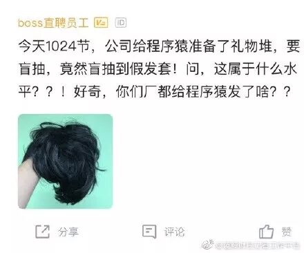 据BOSS直聘程序猿爆料,在程序员节竟然收到一顶假发套。据了解,此次BOSS直聘还准备了iPad pro、机械键盘、Apple Watch解压巨型回车键、减压神器等礼品。