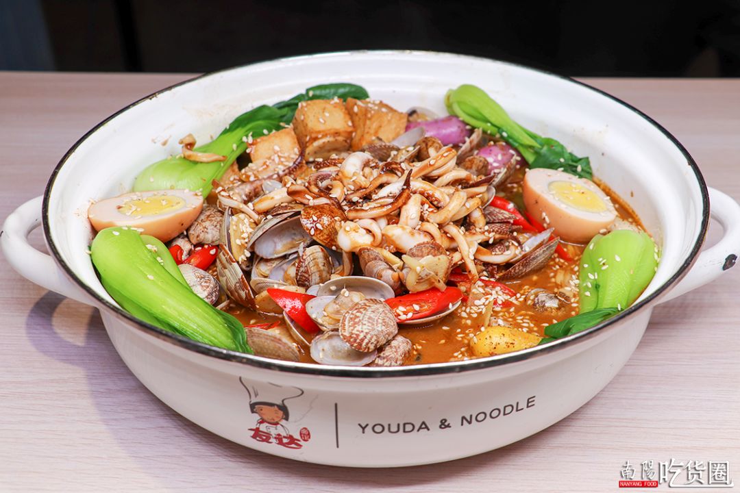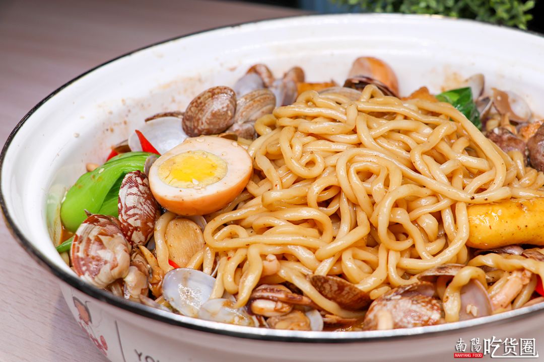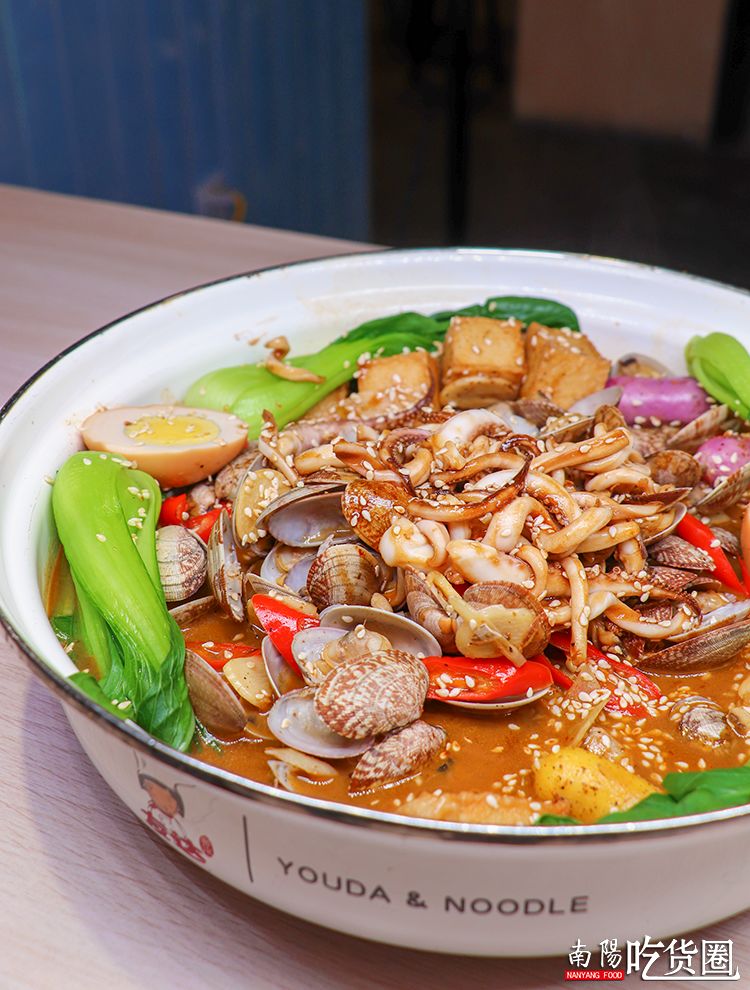 用盆上的金汤肥牛面、鱿鱼花甲面