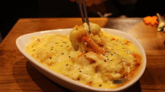 面条和表面厚厚一层芝士碎拌在一起简直是绝配,盘里还有超多年糕、蟹肉棒、贝壳和蔬菜,满足你所有的小心思,吃它的过程像在挖宝藏~